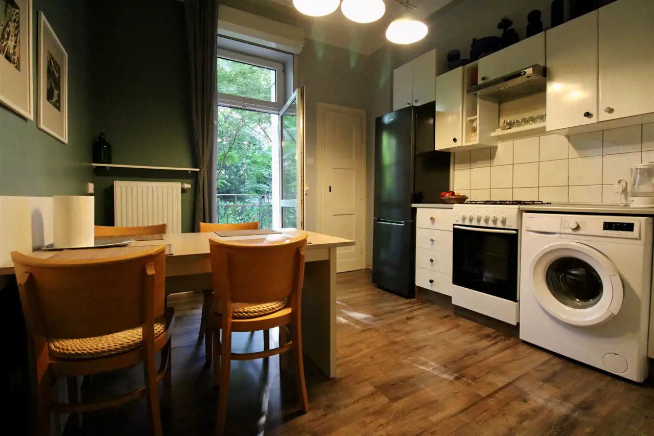 - dużej zabudowanej meblami na wymiar, wyposażonej kuchni z dużym balkonem.