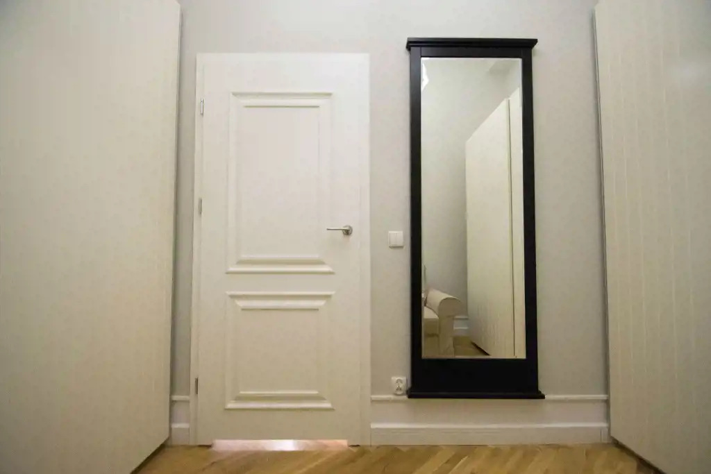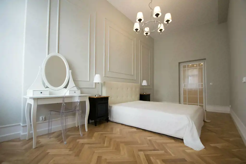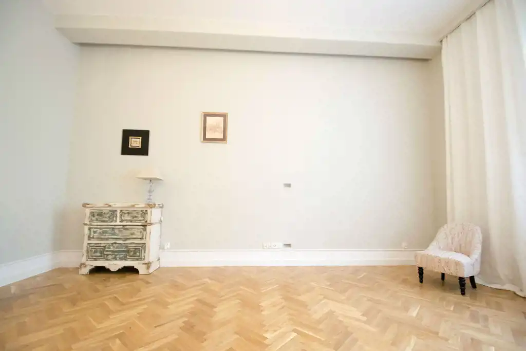 Wnętrze zachwyca wysokimi sufitami podkreślającymi reprezentacyjny charakter mieszkania, oraz klasyczną, stonowaną kolorystyką budującą atmosferę spokoju i wyrafinowania. Apartament składa się z: