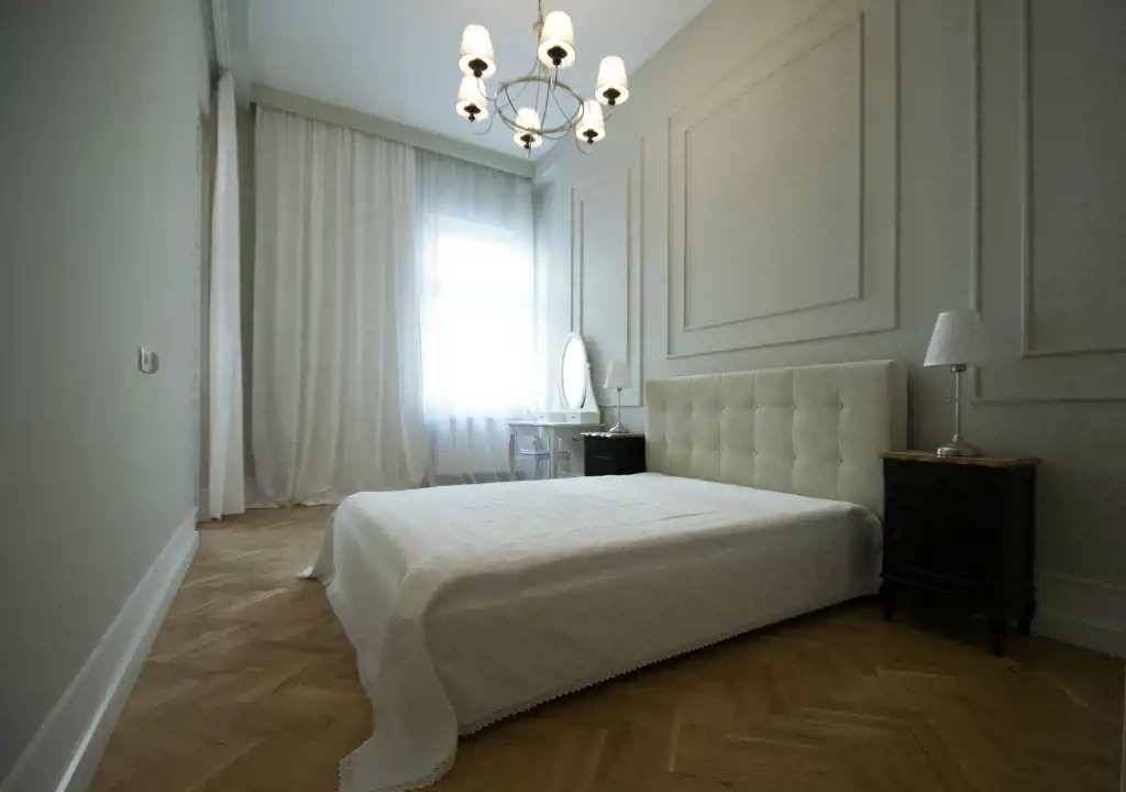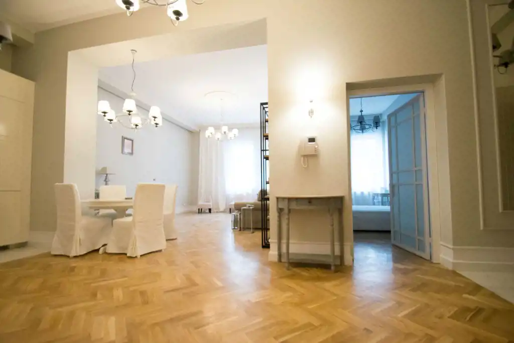 Wnętrze zachwyca wysokimi sufitami podkreślającymi reprezentacyjny charakter mieszkania, oraz klasyczną, stonowaną kolorystyką budującą atmosferę spokoju i wyrafinowania. Apartament składa się z: