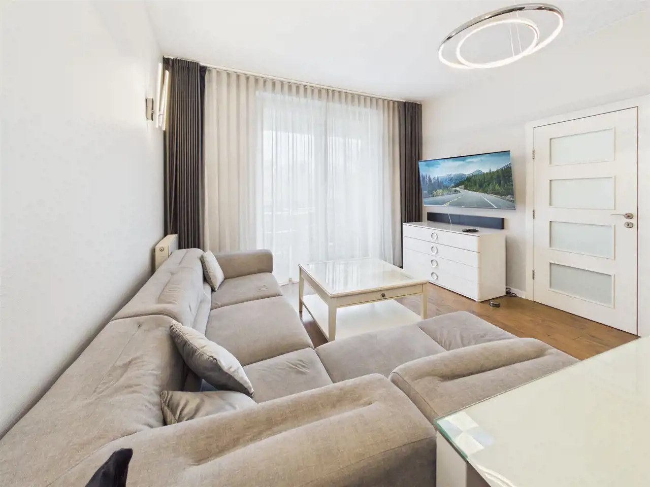 Nowoczesne mieszkanie usytuowane na 4 piętrze, od wewnętrznej strony apartamentowca dzięki czemu panuje w nim cisza i spokój.