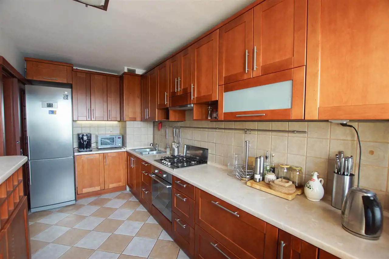 - KUCHNIA wyposażona w meble na miarę wraz ze sprzętem w zabudowie (płyta gazowa, piekarnik elektryczny, zmywarka, duża lodówka z osobnym zamrażalnikiem, okap, chłodziarka na wino, ekspres do kawy, drobne wyposażenie kuchenne jak garnki, sztućce, talerze, szklanki itp.)