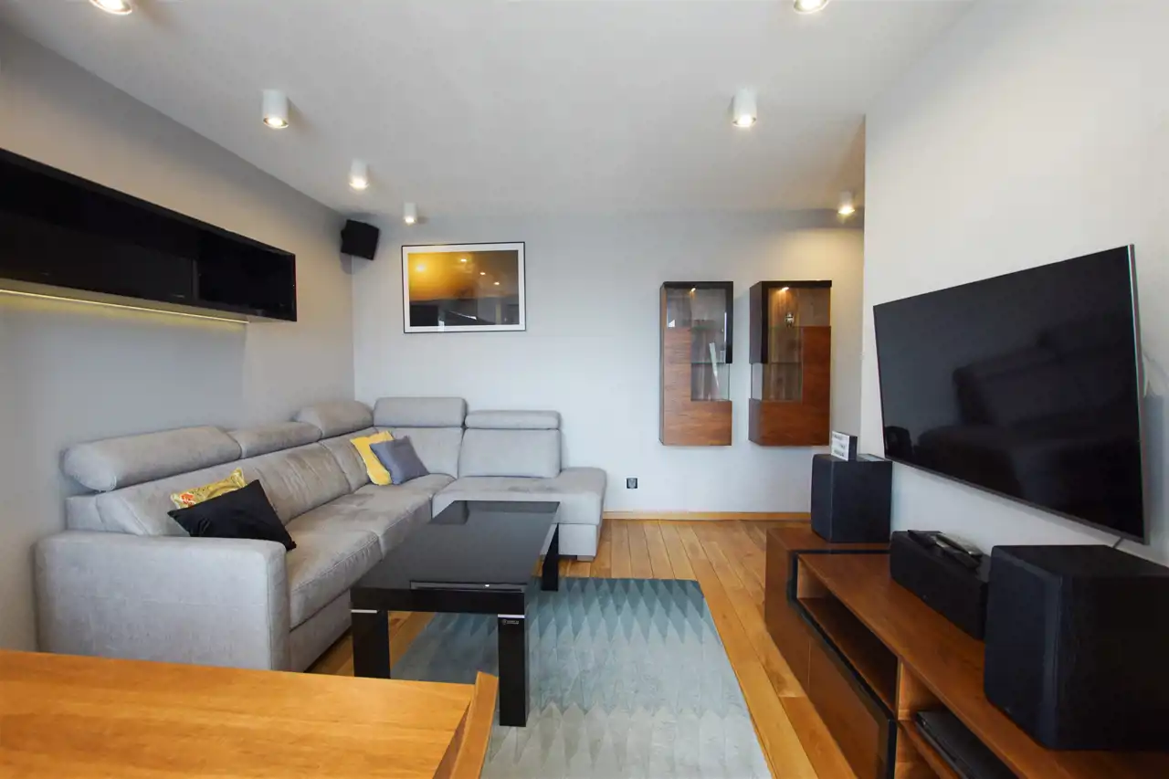 - POKÓJ DZIENNY z dużą zabudowaną loggią od strony południowej, z pięknym widokiem na góry, wyposażony w wygodną sofę narożną rozkładaną, szafkę rtv, telewizor, kino domowe, stolik,