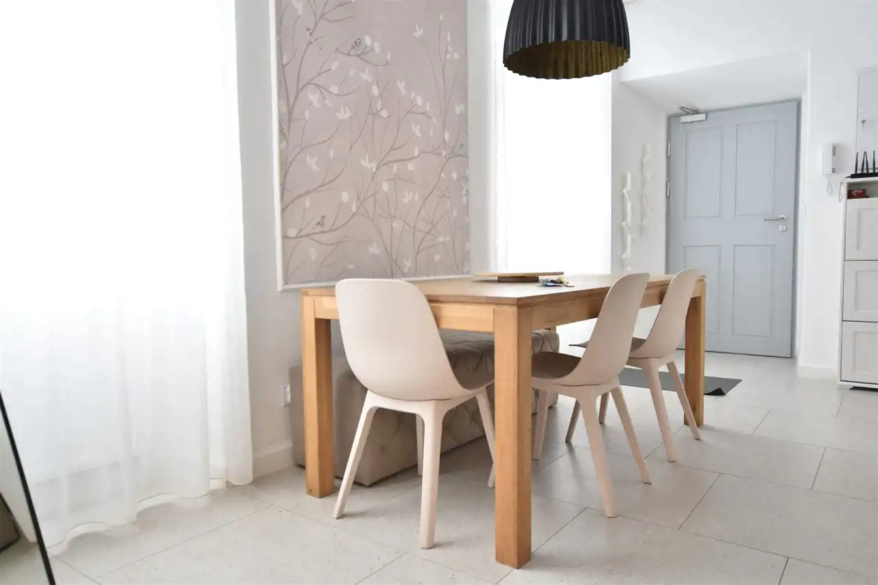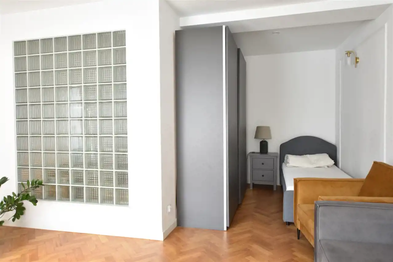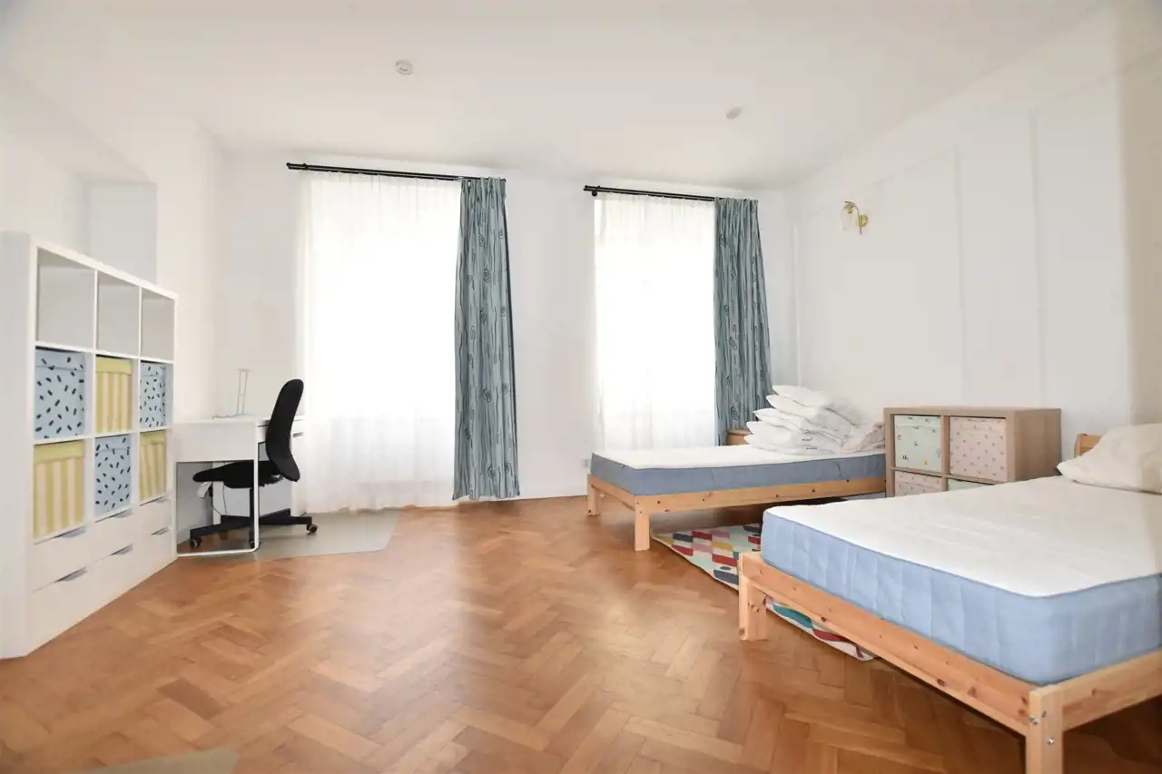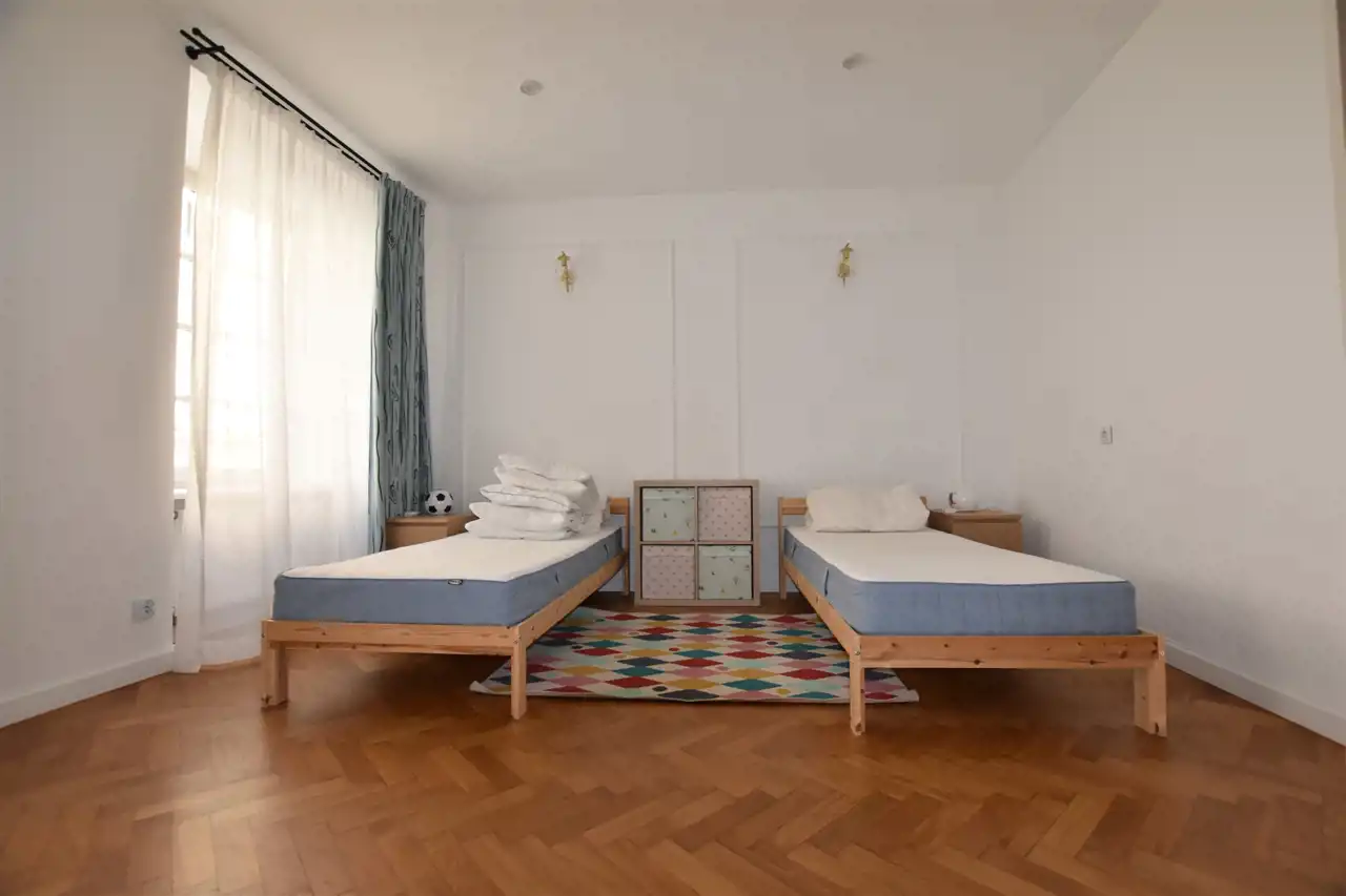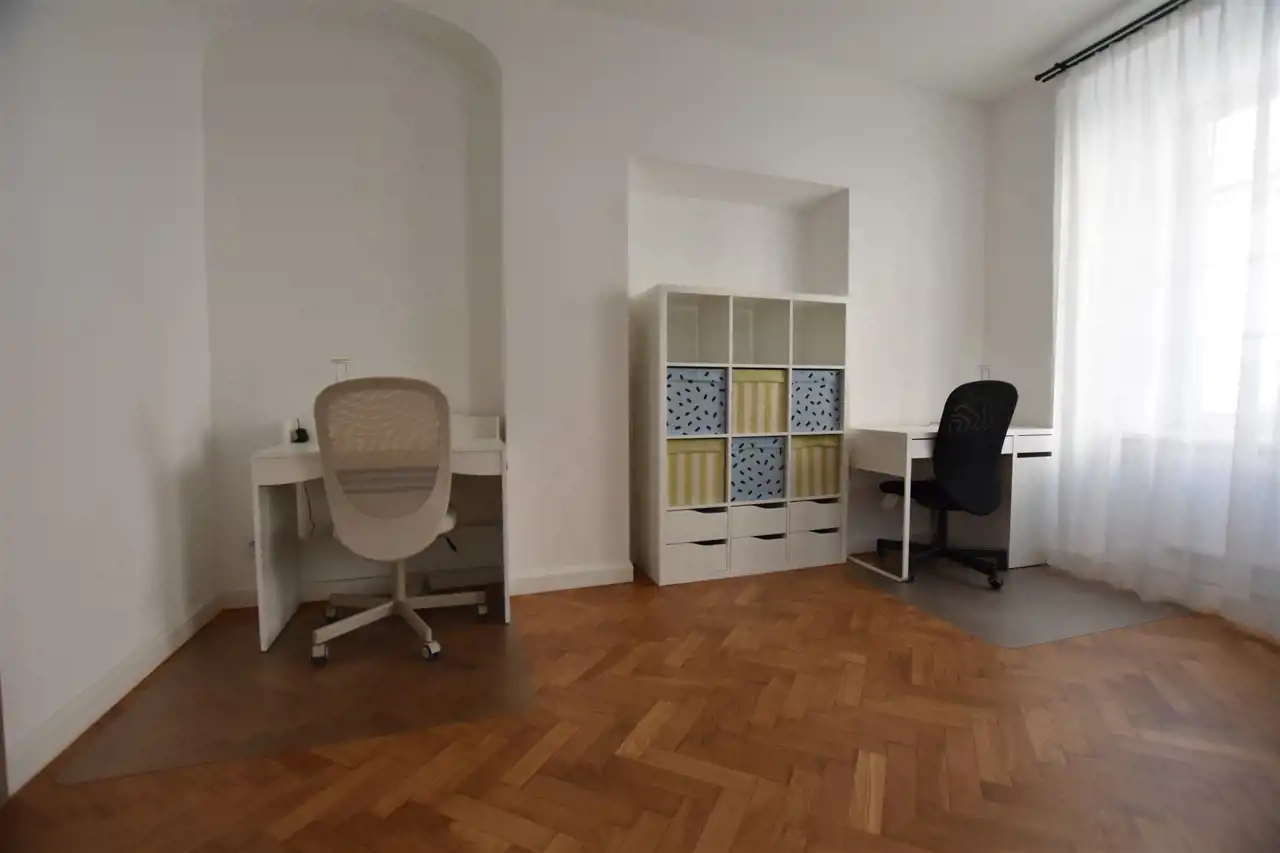 Mieszkanie w pełni wyposażone i umeblowane położone na pierwszym piętrze. W jednej z sypialni dwa pojedyncze łóżka ale istnieje możliwość zakupu dużego. Znajdują się też dwa osobne biurka. Drugi pokój oprócz tego że znajduje się w nim pojedyncze łózko może pełnić role pokoju dziennego gdyż znajduje się w nim też sofa i fotele. Osobno wyposażona kuchnia wraz z częścią jadalnianą. Nowoczesna łazienka z kabiną prysznicową. Mieszkanie jest wysokie, jasne, ciche i przestronne. Osobna łazienka z kabiną prysznicową. W kamienicy jest również winda.