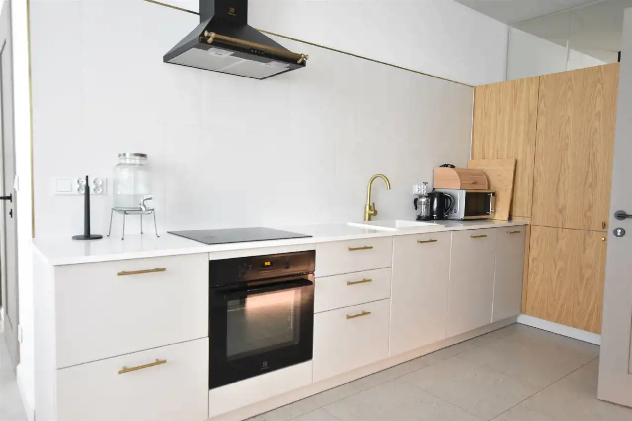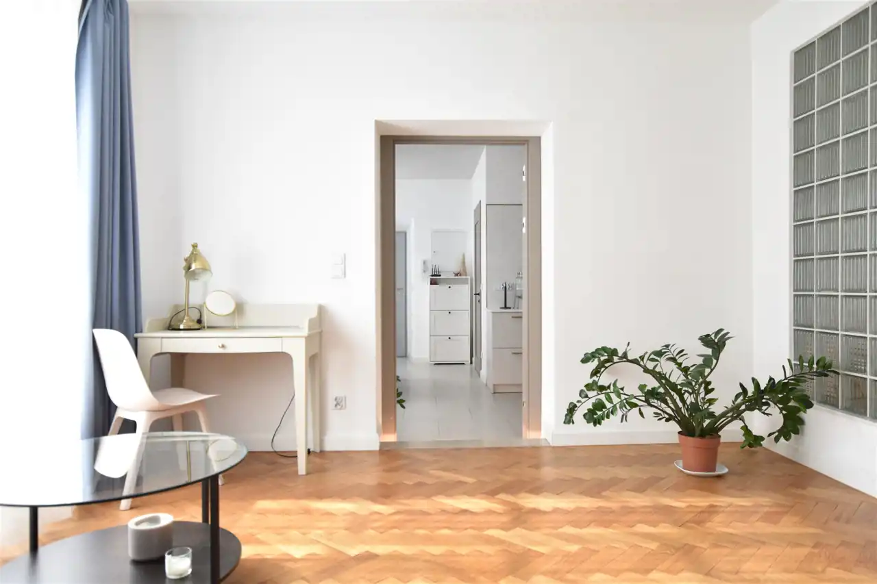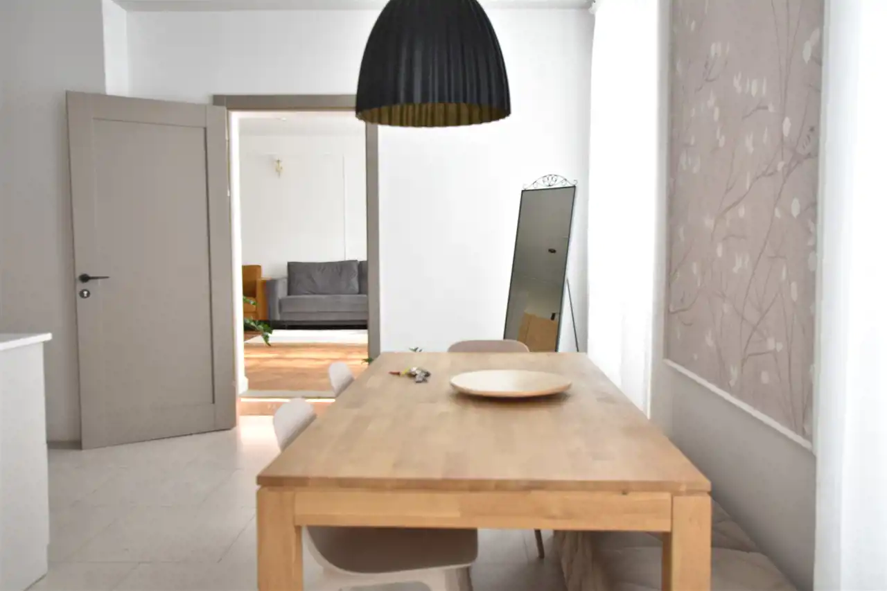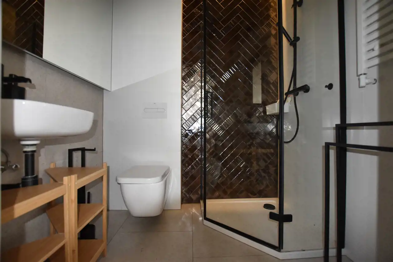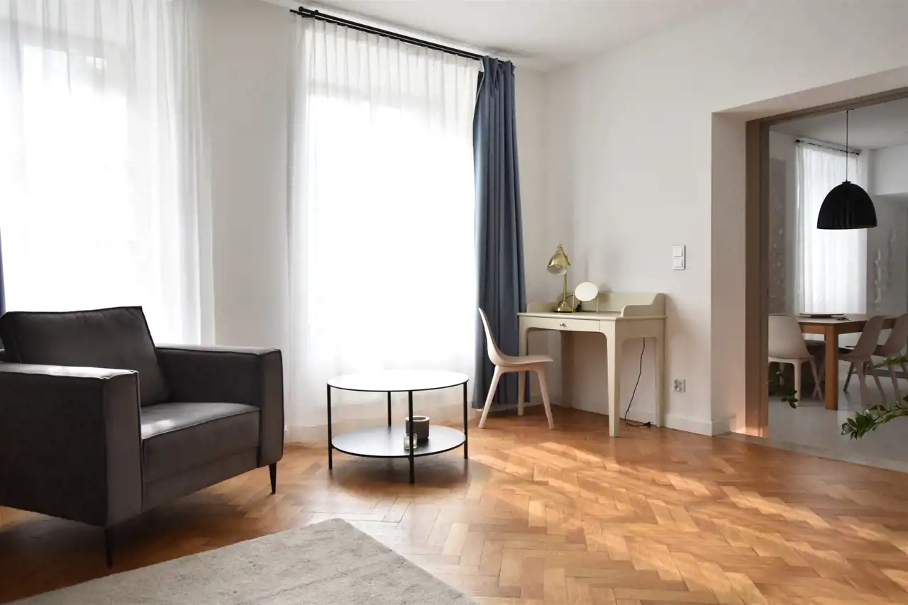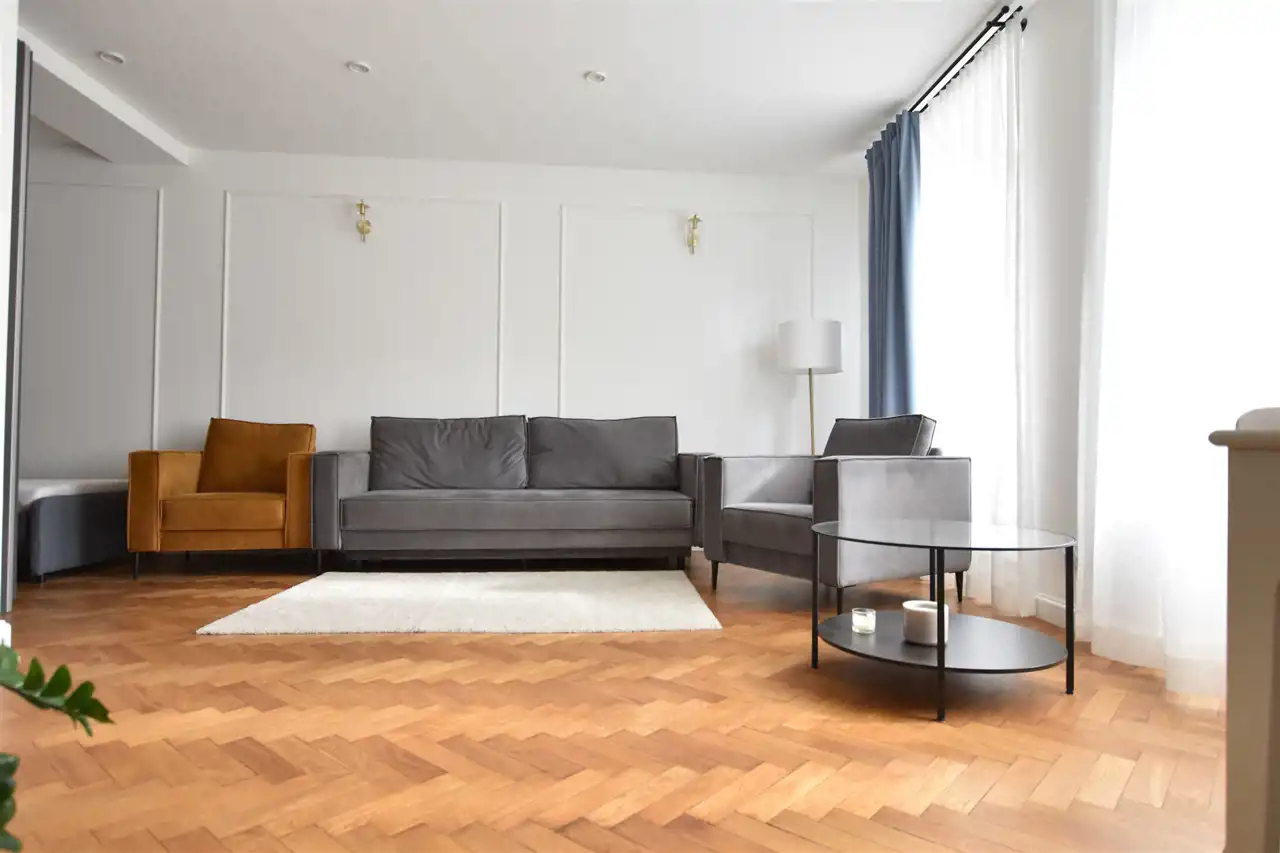 Mieszkanie w pełni wyposażone i umeblowane położone na pierwszym piętrze. W jednej z sypialni dwa pojedyncze łóżka ale istnieje możliwość zakupu dużego. Znajdują się też dwa osobne biurka. Drugi pokój oprócz tego że znajduje się w nim pojedyncze łózko może pełnić role pokoju dziennego gdyż znajduje się w nim też sofa i fotele. Osobno wyposażona kuchnia wraz z częścią jadalnianą. Nowoczesna łazienka z kabiną prysznicową. Mieszkanie jest wysokie, jasne, ciche i przestronne. Osobna łazienka z kabiną prysznicową. W kamienicy jest również winda.