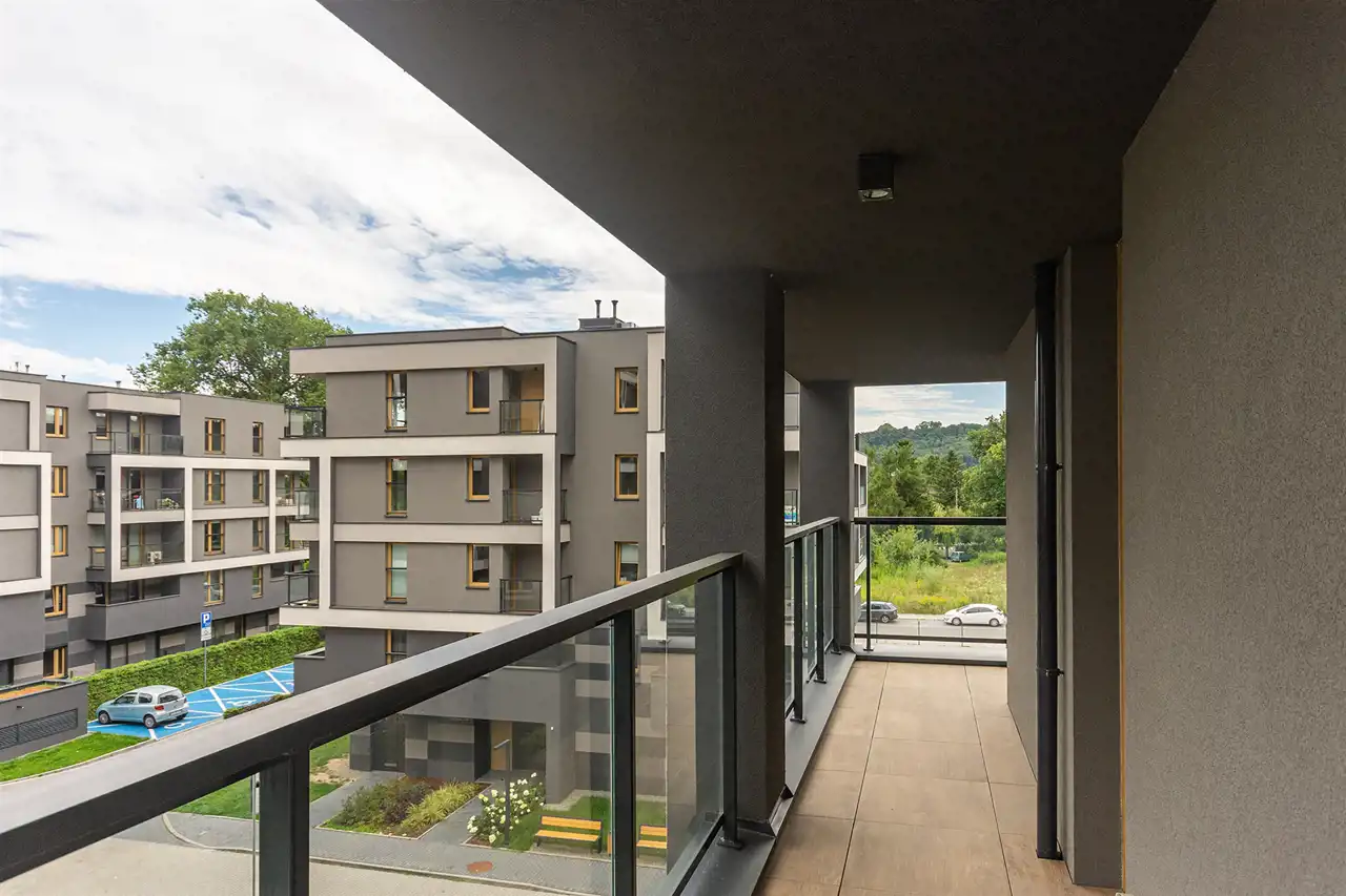 duży balkon z widokiem na Kopiec Kościuszki – idealne miejsce na poranną kawę.