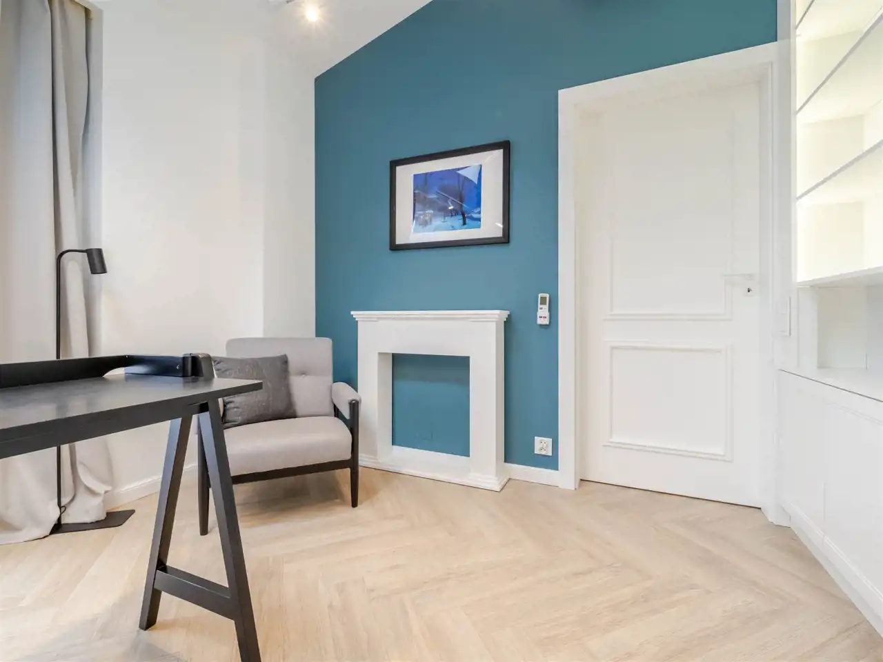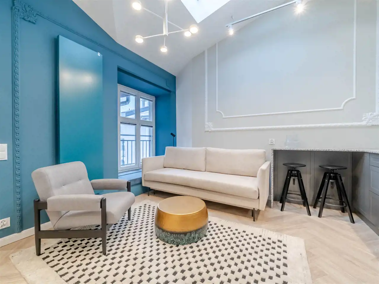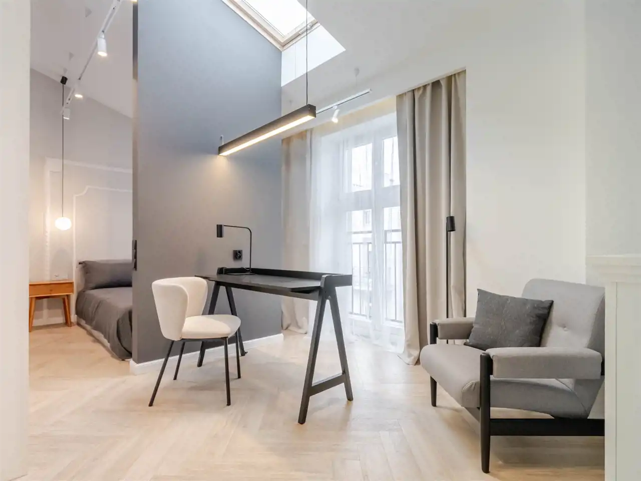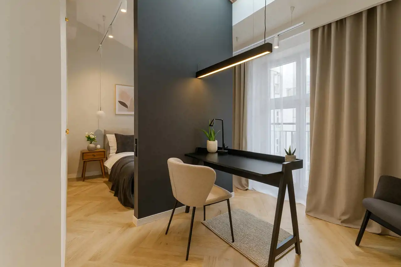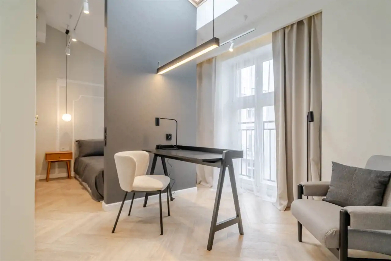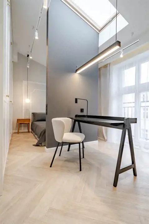 Mieszkanie na 4 tym piętrze z windą, bez sąsiadów u góry, posiada 2 pokoje, wyodrębnioną przestrzeń do pracy, korytarz z małą garderobą, łazienkę z oknami od ziemi do sufitu, kuchnię z oknem połaciowym a całość dopełnia wysokość mieszkania 3 metry.