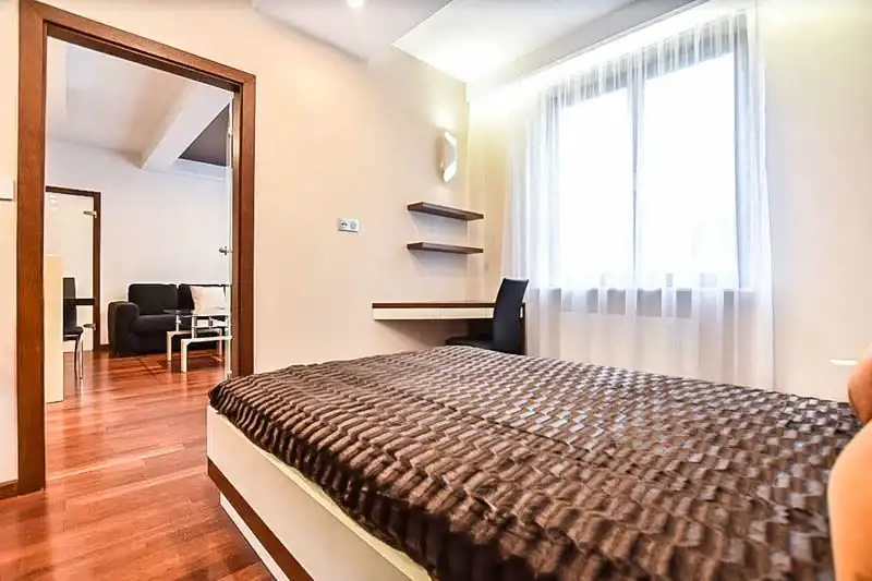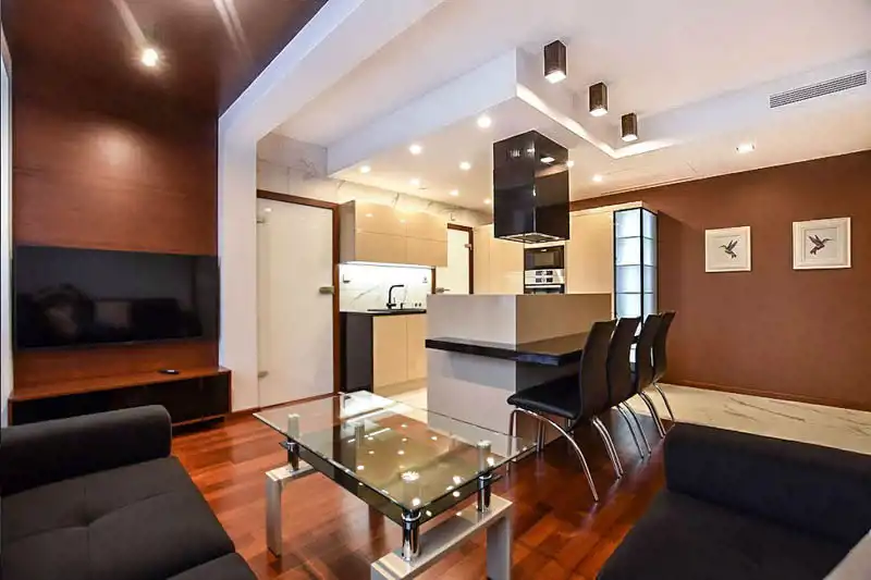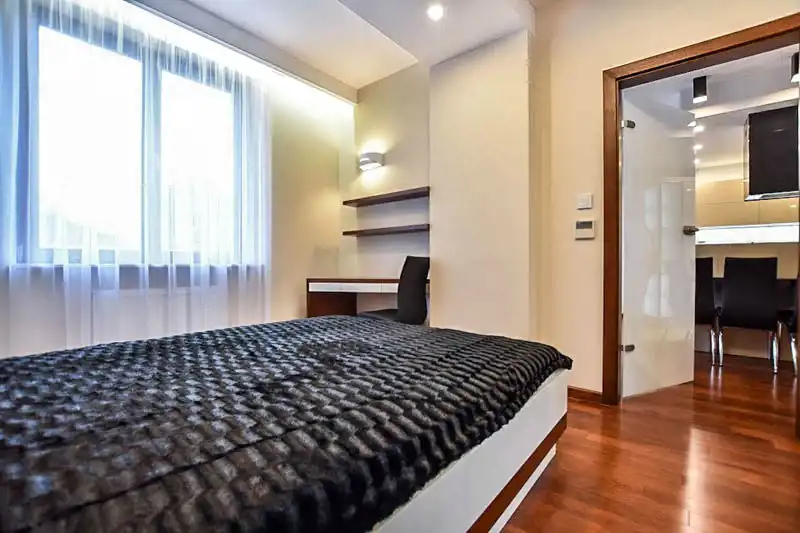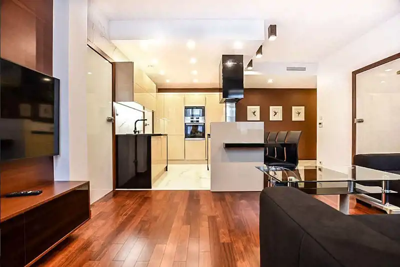 Ta wyjątkowa nieruchomość została wykończona z dbałością o szczegóły według projektu architekta. Wnętrzom dodają klasy elegancja drewniana podłoga, blaty z kamienia naturalnego, wysokiej jakości sprzęt elektroniczny i oraz AGD marki Miele. Na wyposażeniu kuchennym znajdują się płyta indukcyjna, piekarnik, mikrofala, duża lodówko-zamrażarka, pralko-suszarka. Niebywałym plusem apartamentu jest duża powierzchnia do przechowywania m.in. liczne szafy w zabudowie. Apartament jest klimatyzowany i wyposażony w system inteligentnego domu oraz w elektryczne rolety wewnętrzne we wszystkich pomieszczeniach.