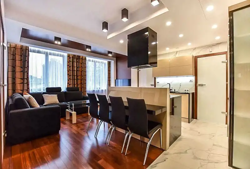 - przestronny salon z aneksem kuchennym,