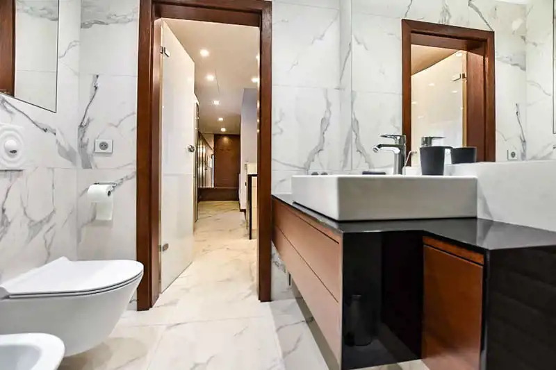 Do wykończenia Rezydencji zastosowano materiały takie jak granit, marmur, mosiądz, szkło hartowane oraz elementy dekoracyjne z onyxu i trawertynu.