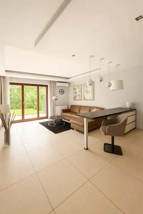 Salon z aneksem kuchennym, jadalnią i wyjściem do ogrodu