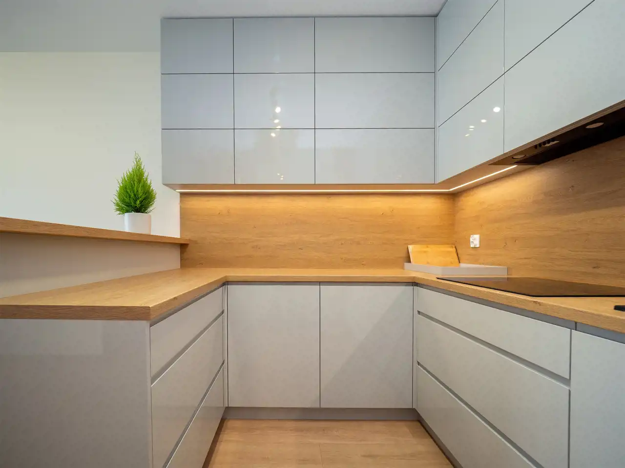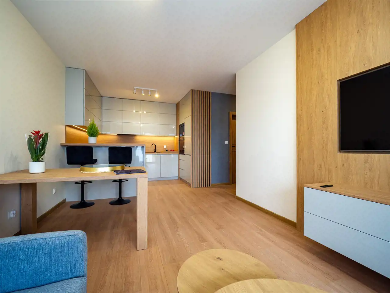- Kuchnia: meble w zabudowie, lodówko-zamrażarka, piekarnik, mikrofala, płyta indukcyjna, wyspa z krzesłami