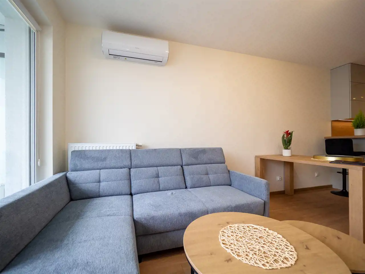 - Salon z aneksem kuchennym i wyjściem na balkon