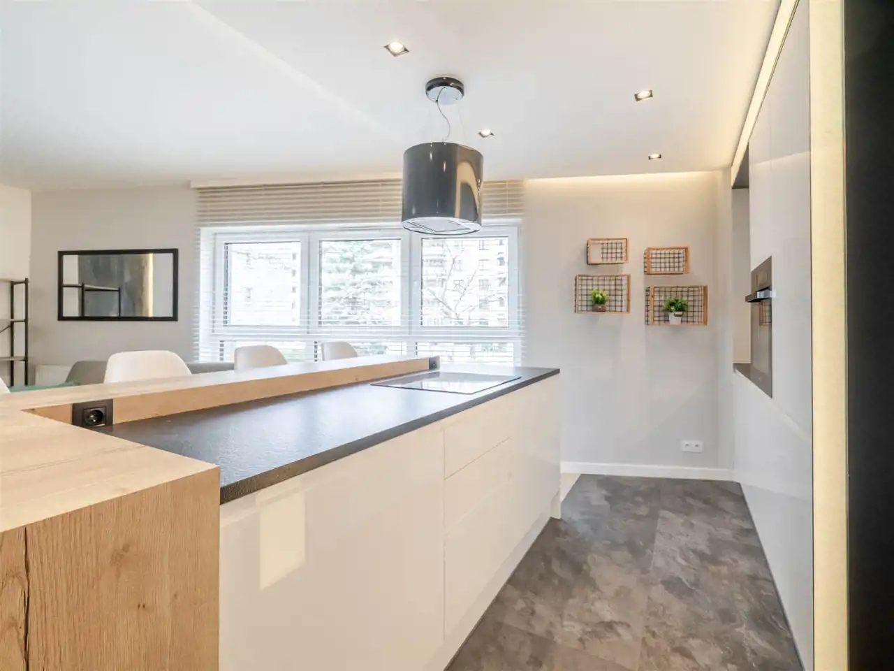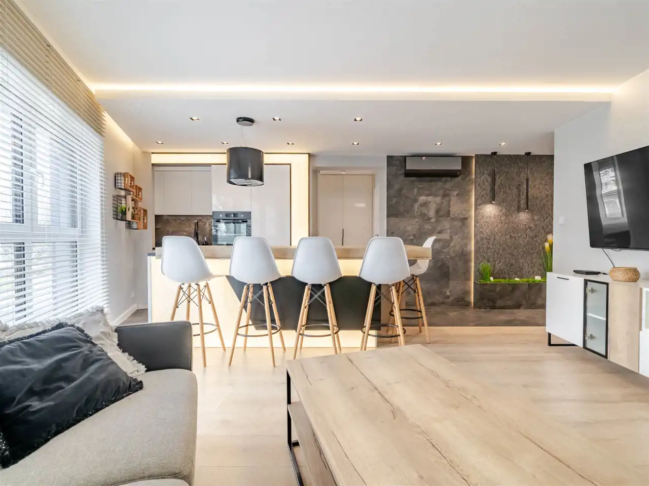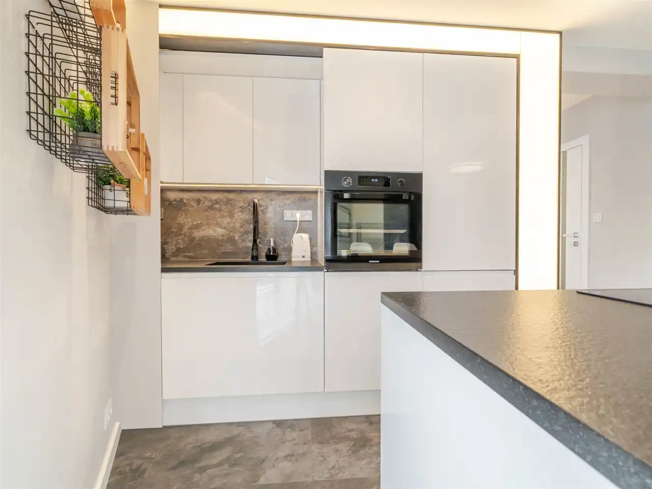 Wnętrze zachwyca otwartą przestrzenią: salon z aneksem kuchennym, w którym centralnym punktem jest stylowa wyspa kuchenna – doskonała do gotowania i spotkań z bliskimi. Dwie komfortowe sypialnie zapewniają prywatność i relaks, a klimatyzacja gwarantuje przyjemny klimat przez cały rok. Kuchnia jest wyposażona w płytę indukcyjną, nowoczesny telewizor oraz kompletny zestaw sprzętu AGD (m.in. pralka, suszarka) – wszystko, co potrzebne do codziennego korzystania. Salon z telewizorem jest idealna nie tylko do relaksu, ale i do pracy z domu.