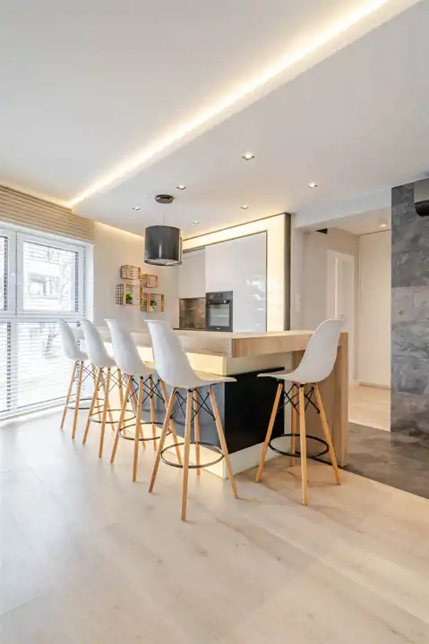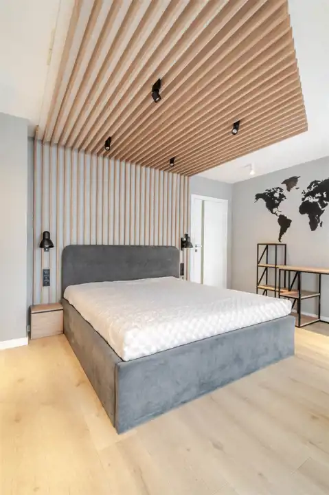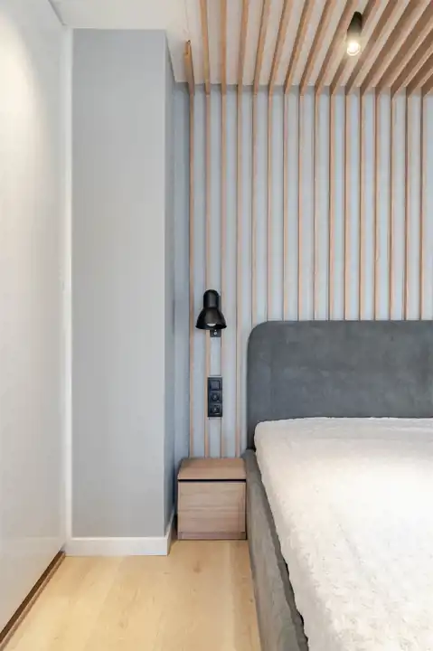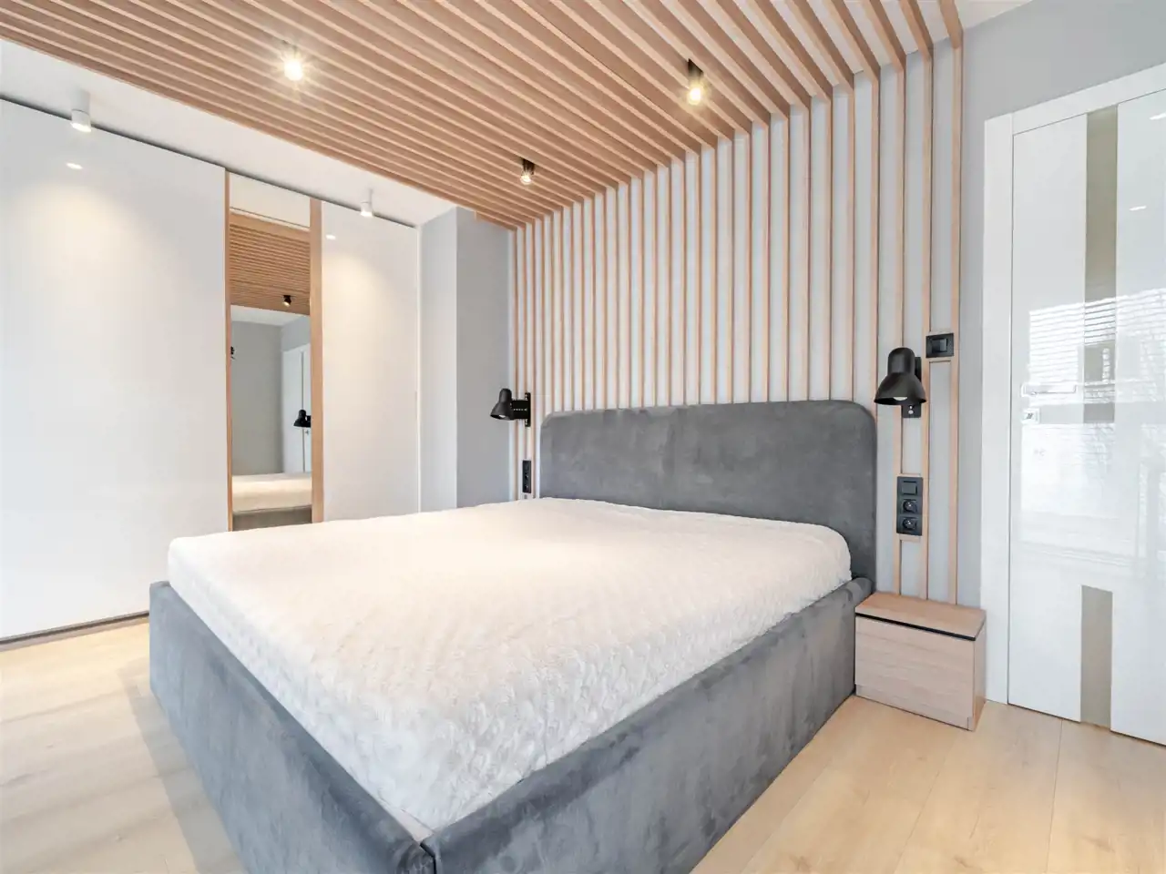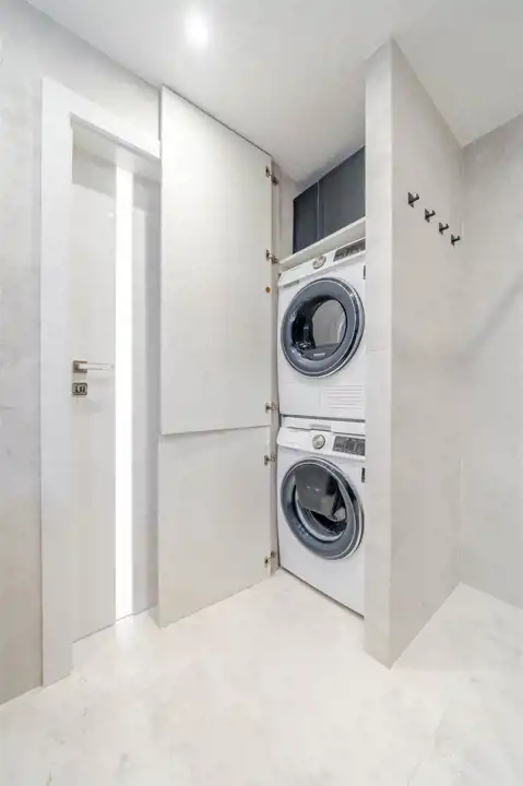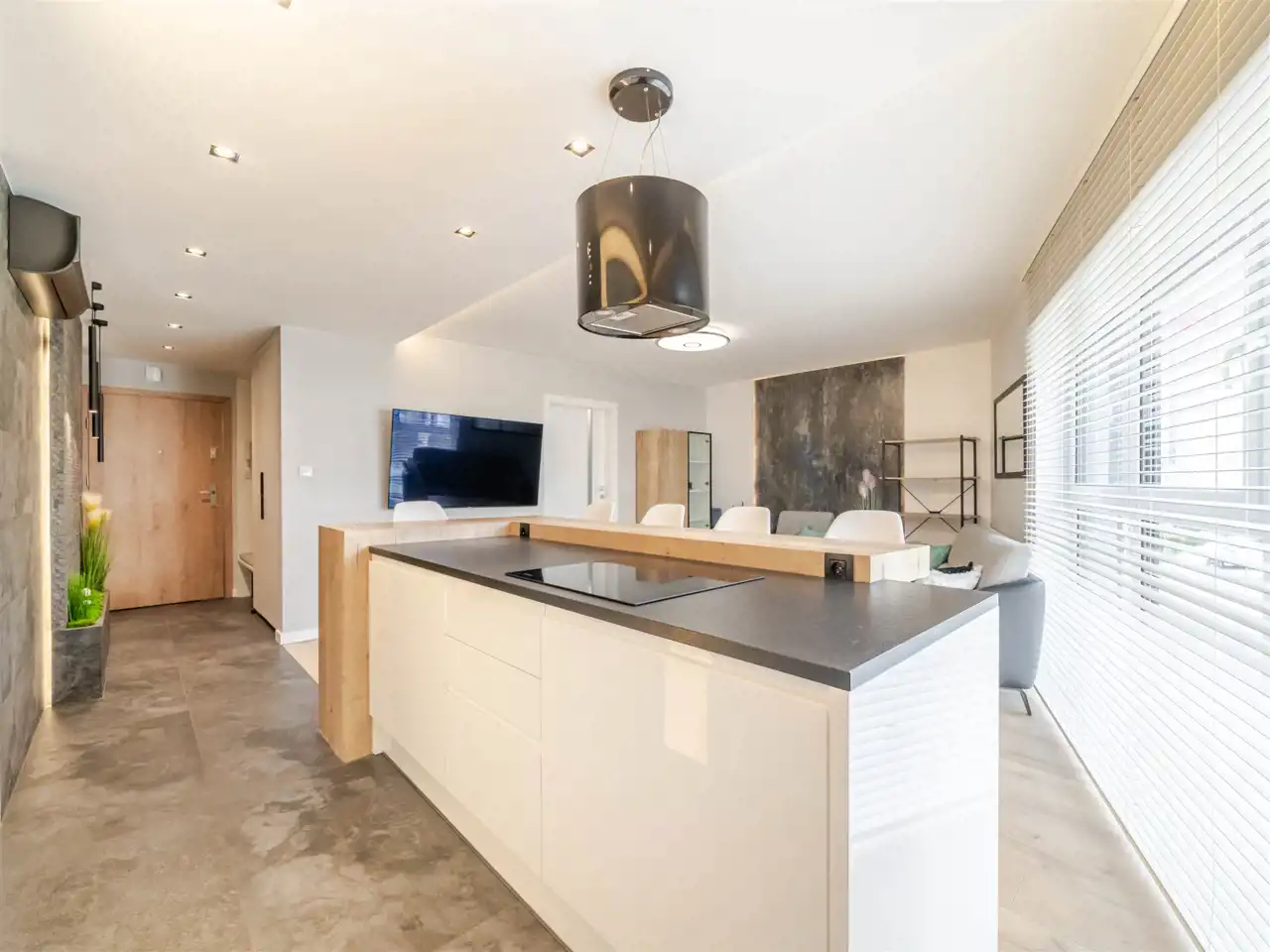 Wnętrze zachwyca otwartą przestrzenią: salon z aneksem kuchennym, w którym centralnym punktem jest stylowa wyspa kuchenna – doskonała do gotowania i spotkań z bliskimi. Dwie komfortowe sypialnie zapewniają prywatność i relaks, a klimatyzacja gwarantuje przyjemny klimat przez cały rok. Kuchnia jest wyposażona w płytę indukcyjną, nowoczesny telewizor oraz kompletny zestaw sprzętu AGD (m.in. pralka, suszarka) – wszystko, co potrzebne do codziennego korzystania. Salon z telewizorem jest idealna nie tylko do relaksu, ale i do pracy z domu.