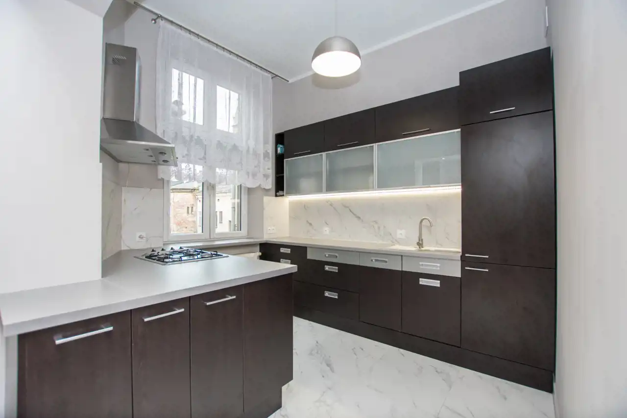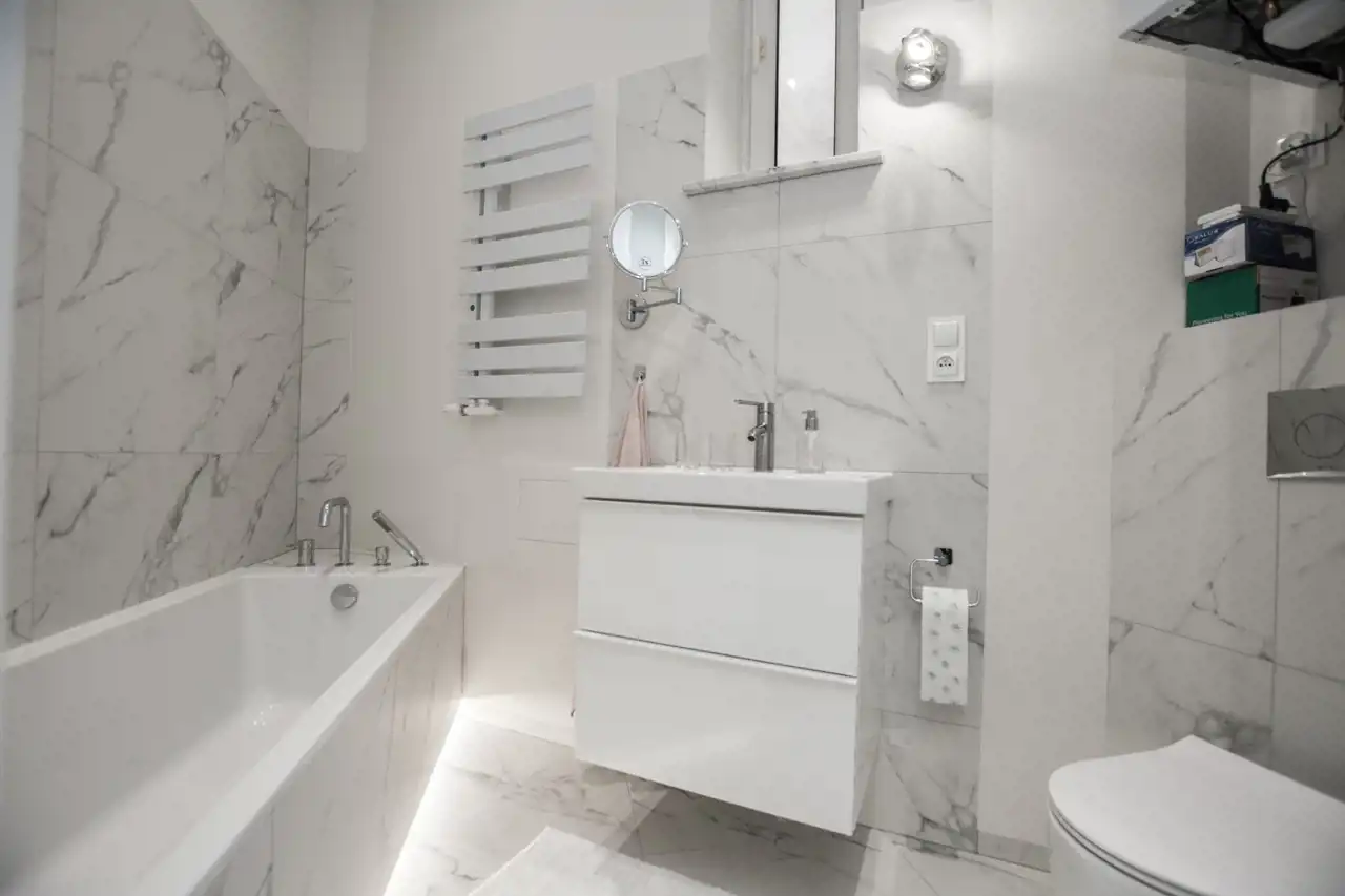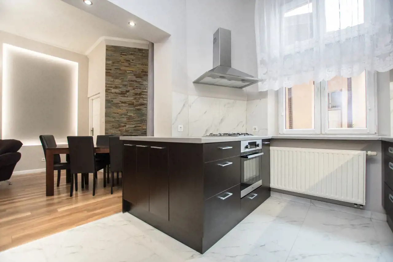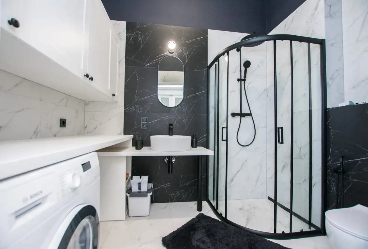 - W pełni wyposażona kuchnia (lodówka, piekarnik, kuchenka mikrofalowa, zmywarka)