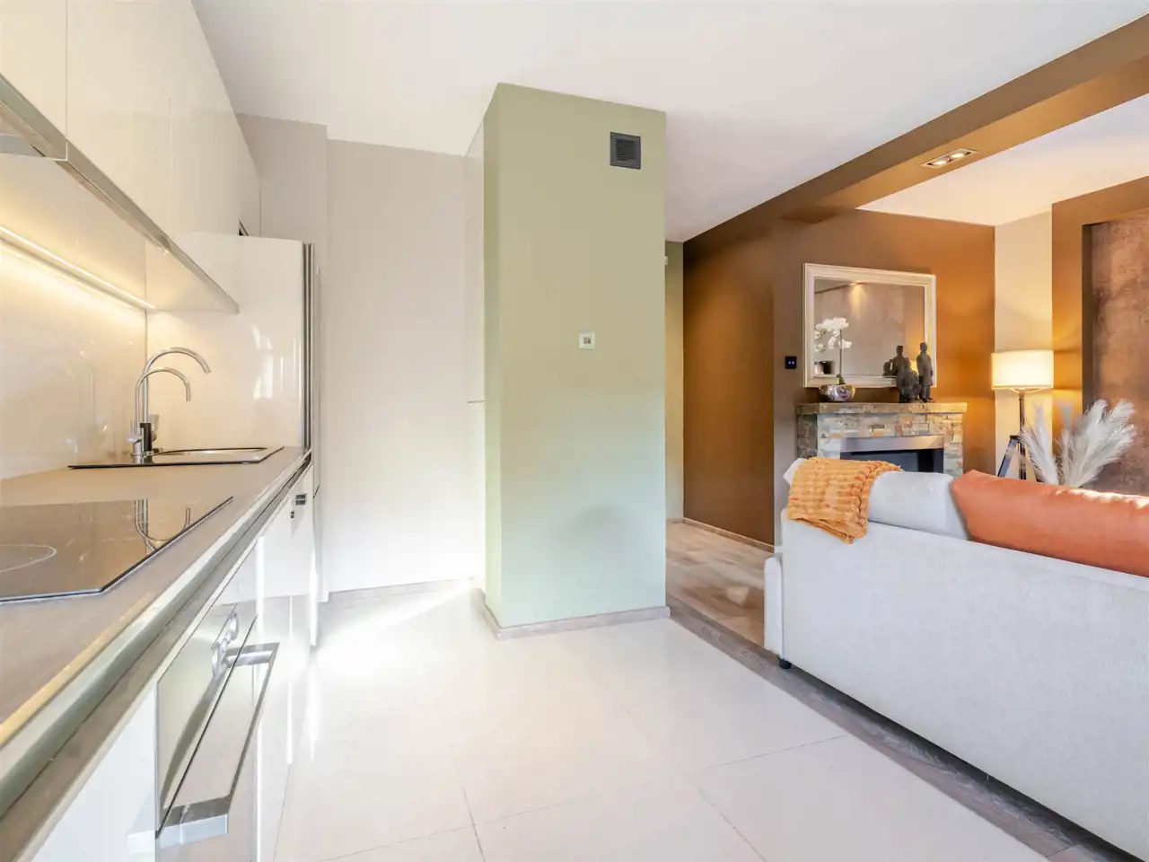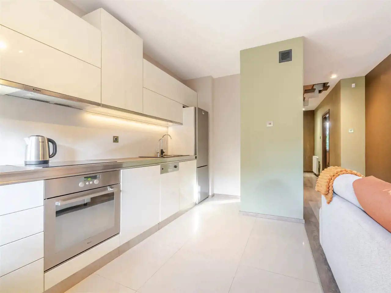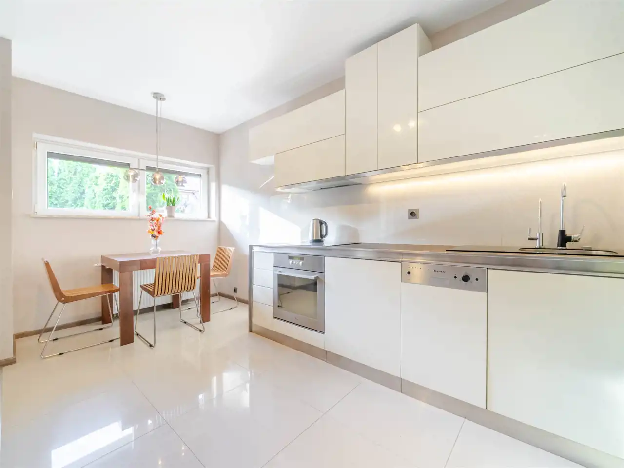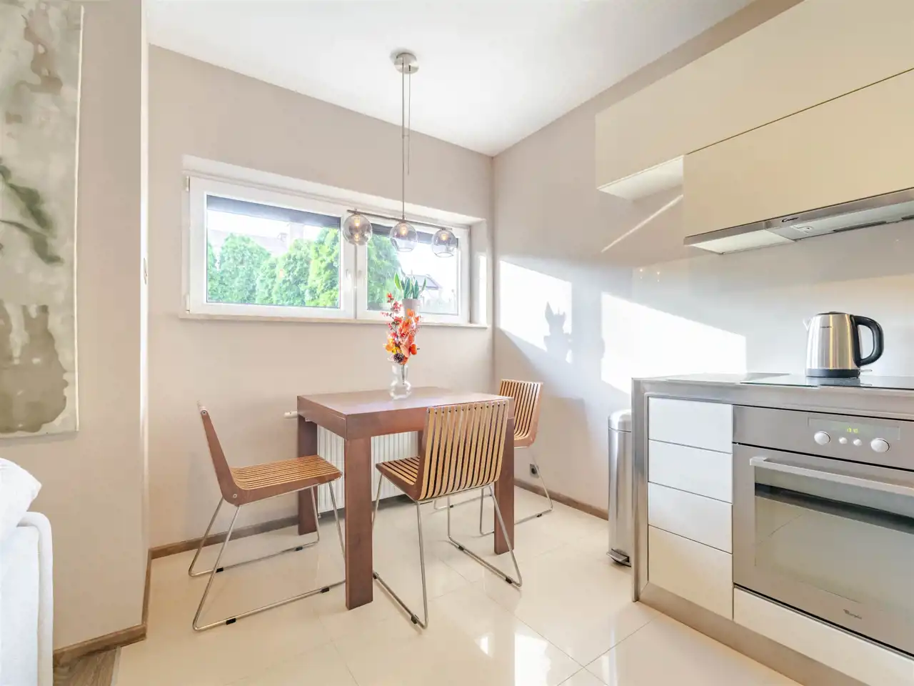 Kuchnia wyposażona w pełny sprzęt AGD wysokiej klasy, łazienki elegancko urządzone z dbałością o detale.