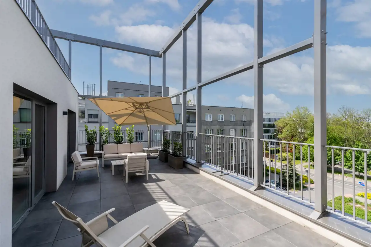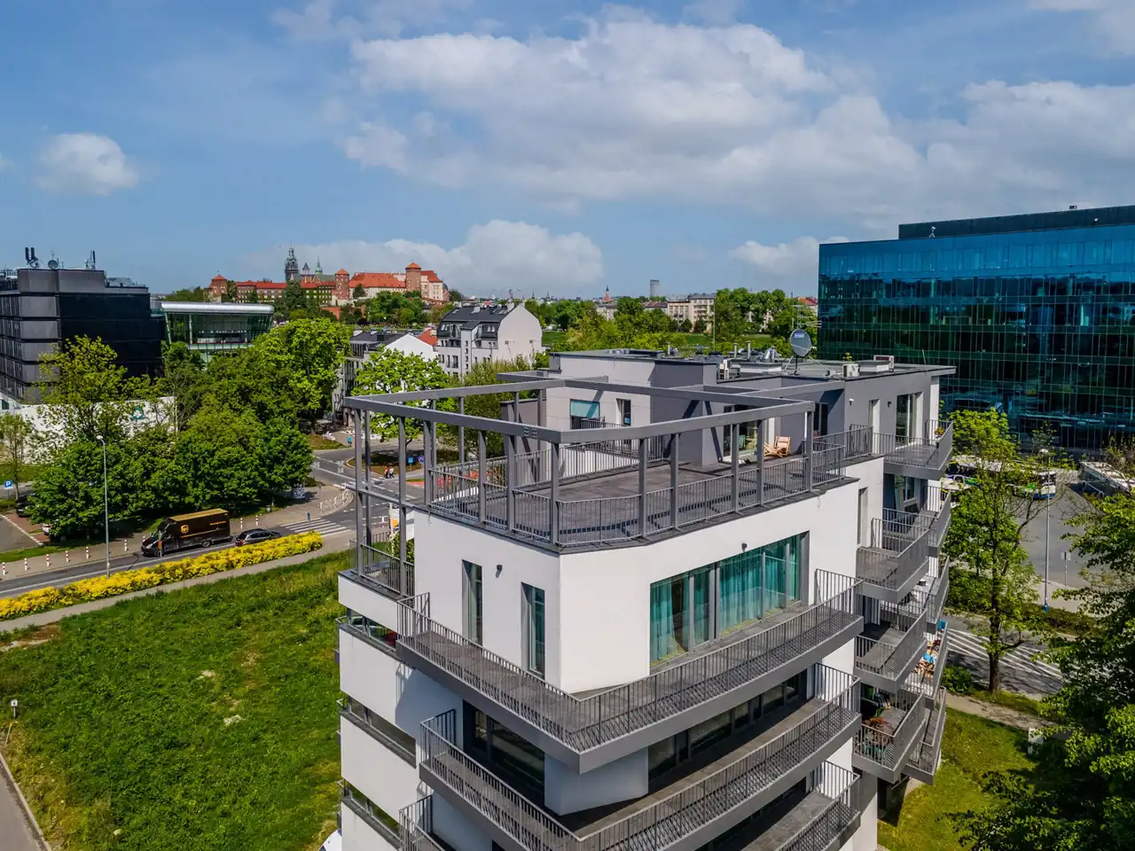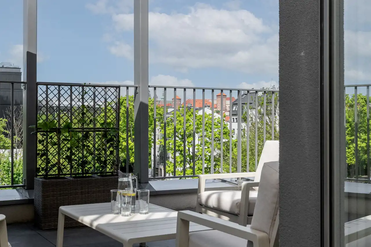 Apartament jest nowy , znajduje się na 4 pietrze , jest trójstronny ( wschód - zachód - południe ) i otoczony tarasami o łacznej powierzchni 65 m2. Składa się z przestronnego salonu z kuchnią i jadalnią oraz wyjściem na duży balkon , dwóch sypialni ( obie umeblowane w duże podwójne łóżka i szafy ) z których jest wyjście na duży 40 m2 taras z pięknym panoramicznym widokiem na miasto i zamek Wawel , łazienki z wanną oraz przedpokoju z szafami. Został ciepło i przyjemnie zaprojektowany oraz wykończony wedle projektu. Dużym atutem mieszkania jest jego doświetlenie - duże panoramiczne okna z każdej strony mieszkania oraz oczywiście urządzony widokowy taras na którym można zrelaksować się po pracy , zdalnie pracować lub po prostu wspaniale spędzić czas z przyjaciółmi.