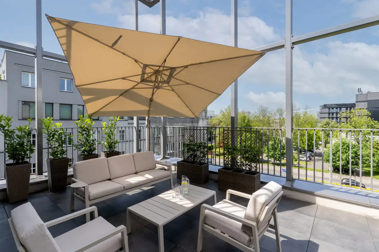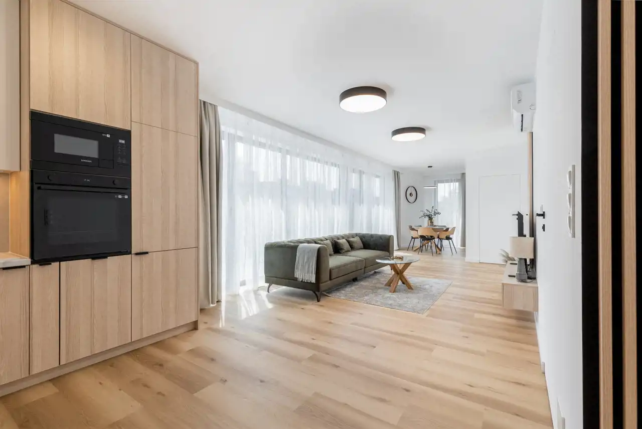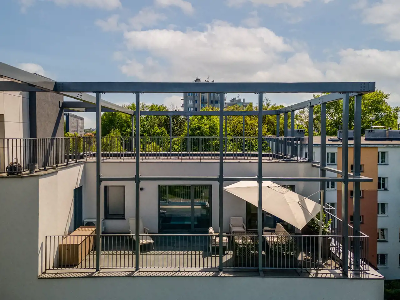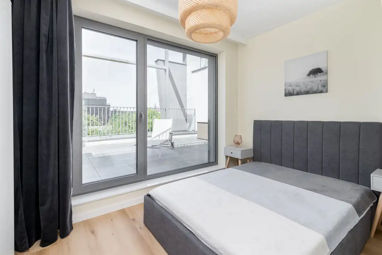 Apartament jest nowy , znajduje się na 4 pietrze , jest trójstronny ( wschód - zachód - południe ) i otoczony tarasami o łacznej powierzchni 65 m2. Składa się z przestronnego salonu z kuchnią i jadalnią oraz wyjściem na duży balkon , dwóch sypialni ( obie umeblowane w duże podwójne łóżka i szafy ) z których jest wyjście na duży 40 m2 taras z pięknym panoramicznym widokiem na miasto i zamek Wawel , łazienki z wanną oraz przedpokoju z szafami. Został ciepło i przyjemnie zaprojektowany oraz wykończony wedle projektu. Dużym atutem mieszkania jest jego doświetlenie - duże panoramiczne okna z każdej strony mieszkania oraz oczywiście urządzony widokowy taras na którym można zrelaksować się po pracy , zdalnie pracować lub po prostu wspaniale spędzić czas z przyjaciółmi.