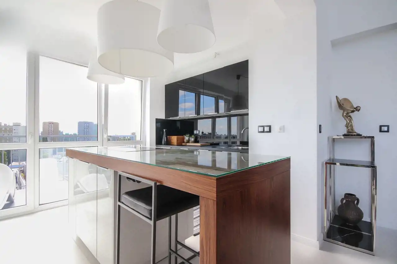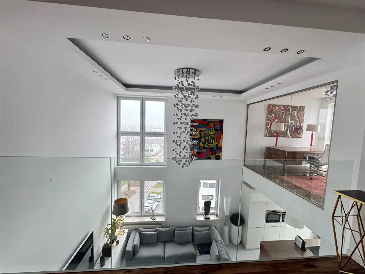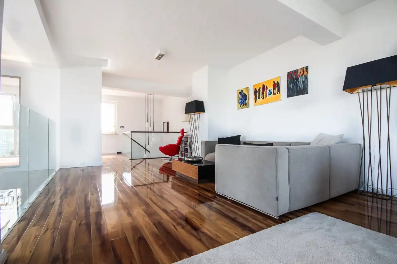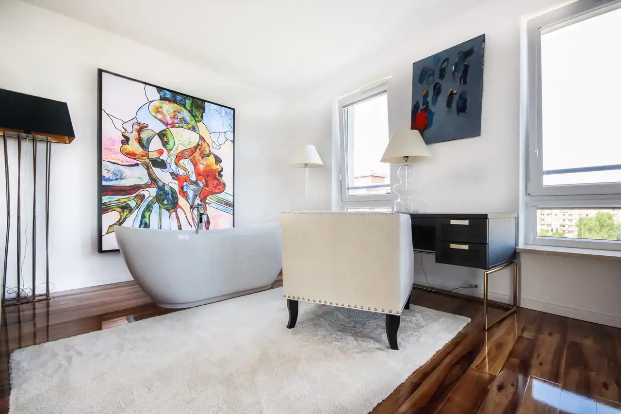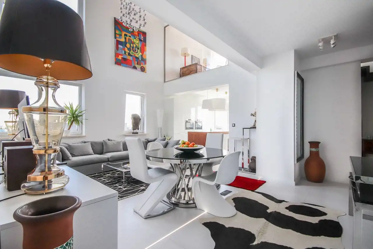 Ten dwupoziomowy apartament urządzony został w stylu inspirowanym nowojorskim loftem – z dużymi przeszkleniami, otwartą przestrzenią i niebanalnymi detalami. Zastosowanie najwyższej klasy materiałów, starannie dobranych mebli oraz autorskiej sztuki sprawia, że wnętrze to nie tylko komfortowa przestrzeń do życia, ale też osobista galeria i oaza stylu.