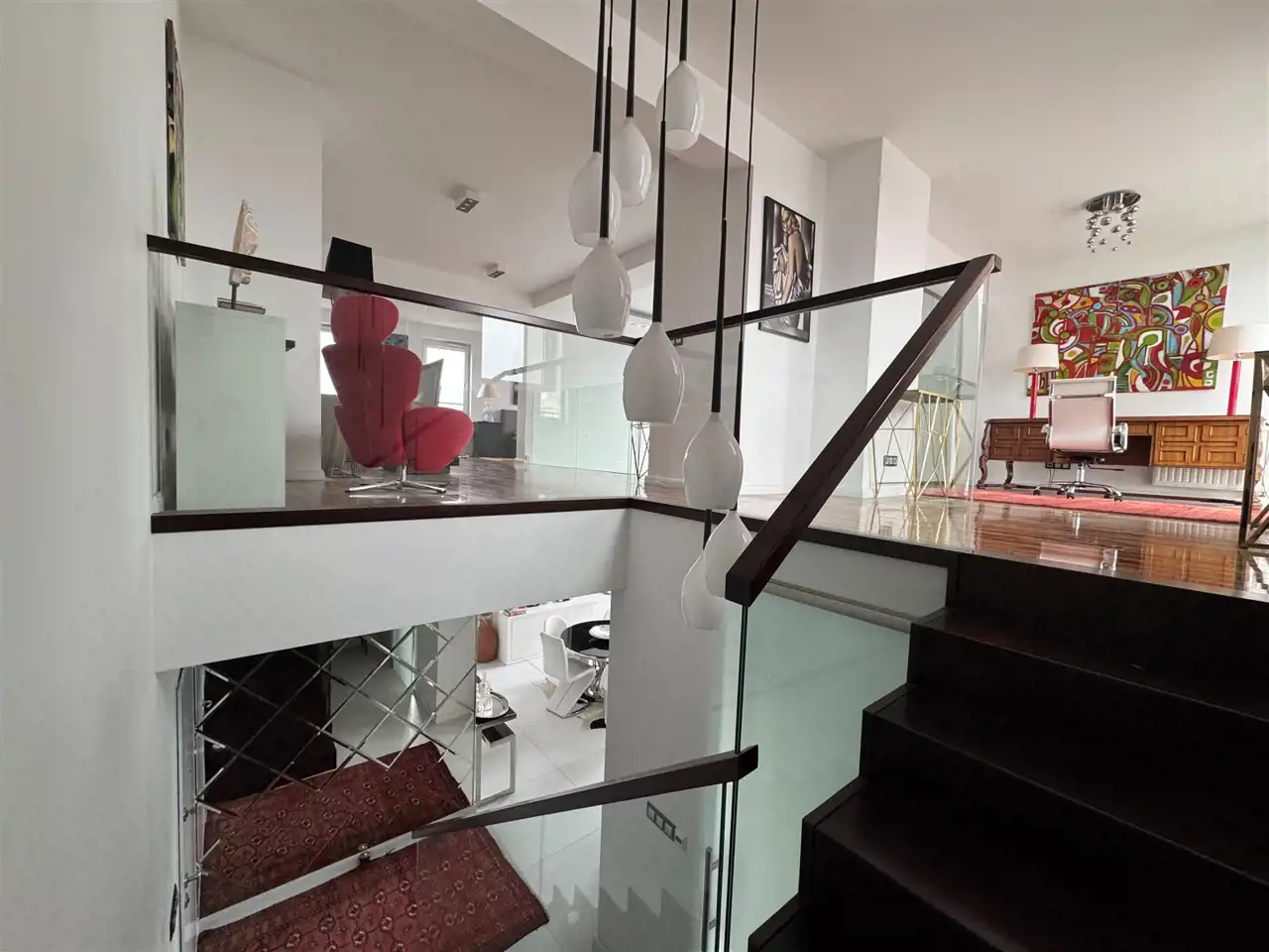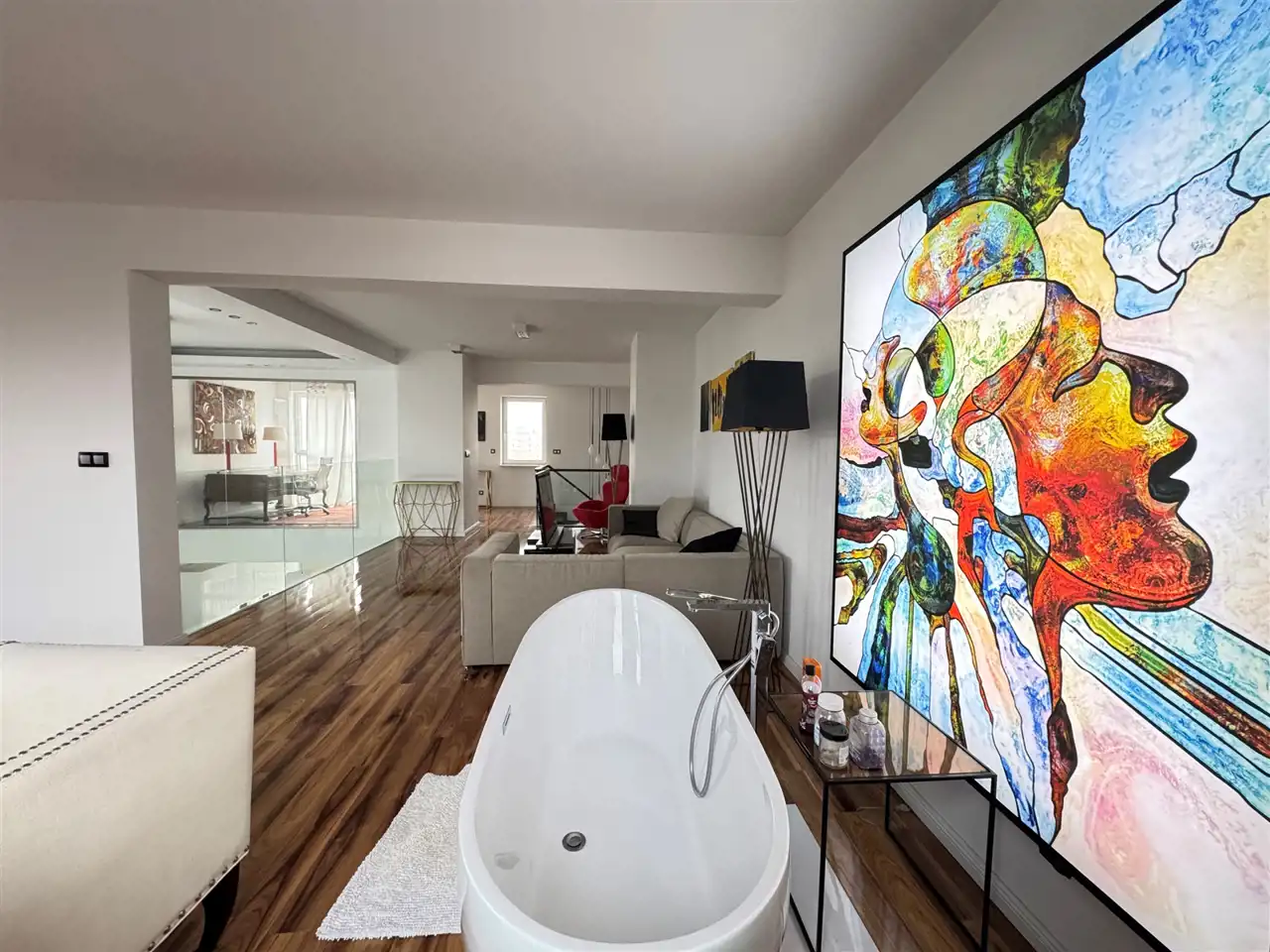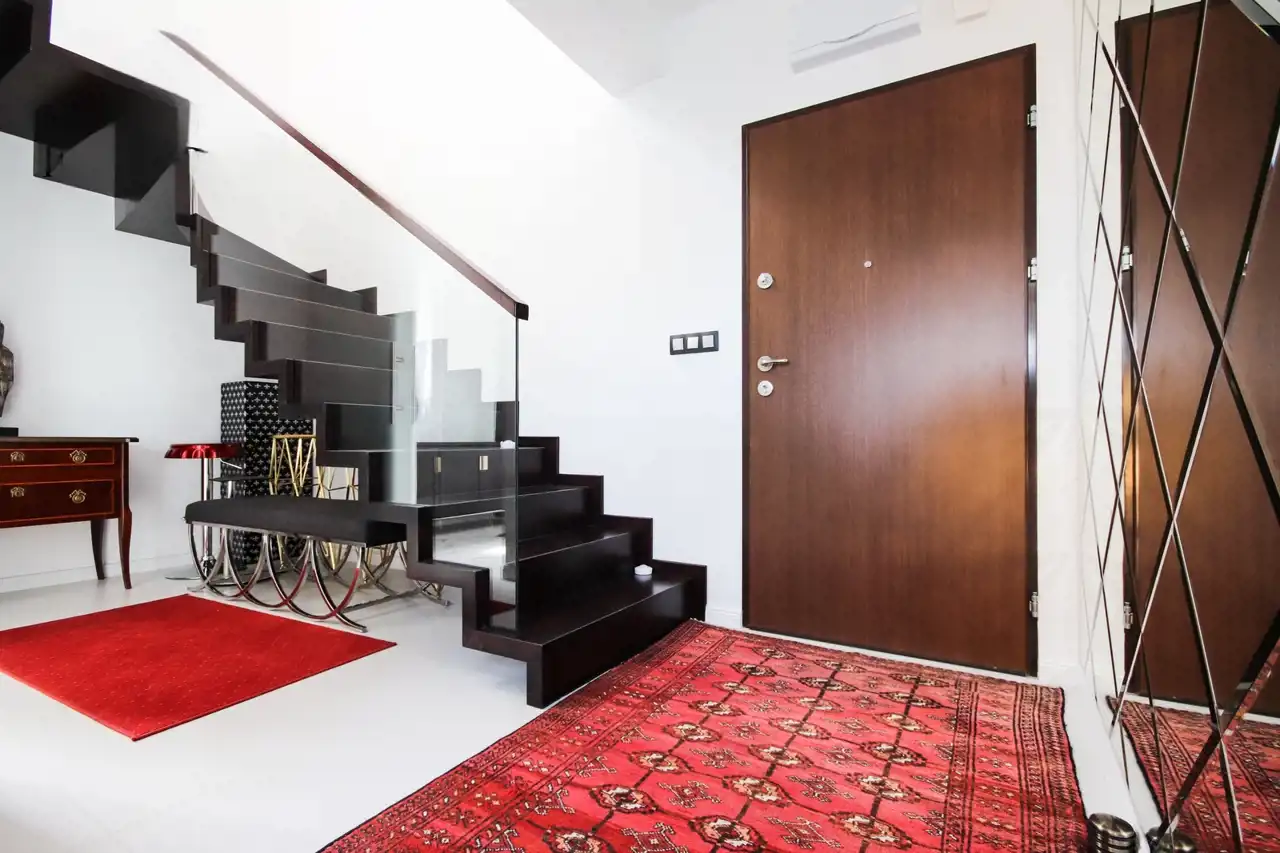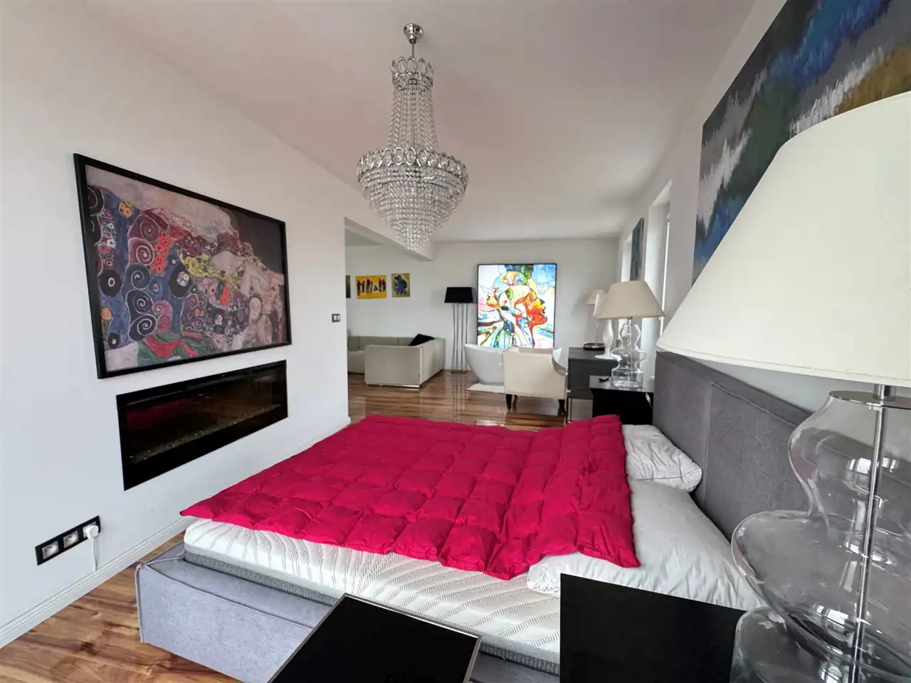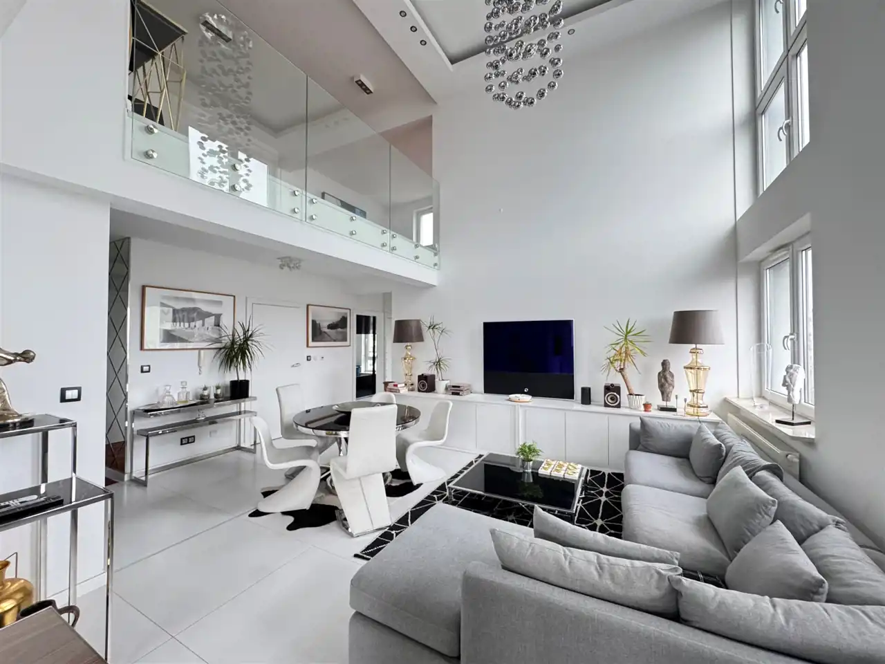 Ten dwupoziomowy apartament urządzony został w stylu inspirowanym nowojorskim loftem – z dużymi przeszkleniami, otwartą przestrzenią i niebanalnymi detalami. Zastosowanie najwyższej klasy materiałów, starannie dobranych mebli oraz autorskiej sztuki sprawia, że wnętrze to nie tylko komfortowa przestrzeń do życia, ale też osobista galeria i oaza stylu.