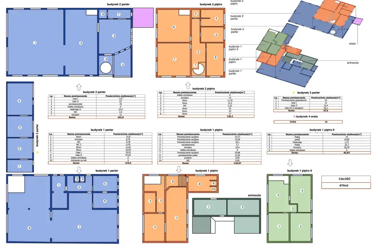 Łączna powierzchnia zabudowy budynków wynosi- 637 m2, powierzchnia użytkowa budynków wynosi- 870 m2
