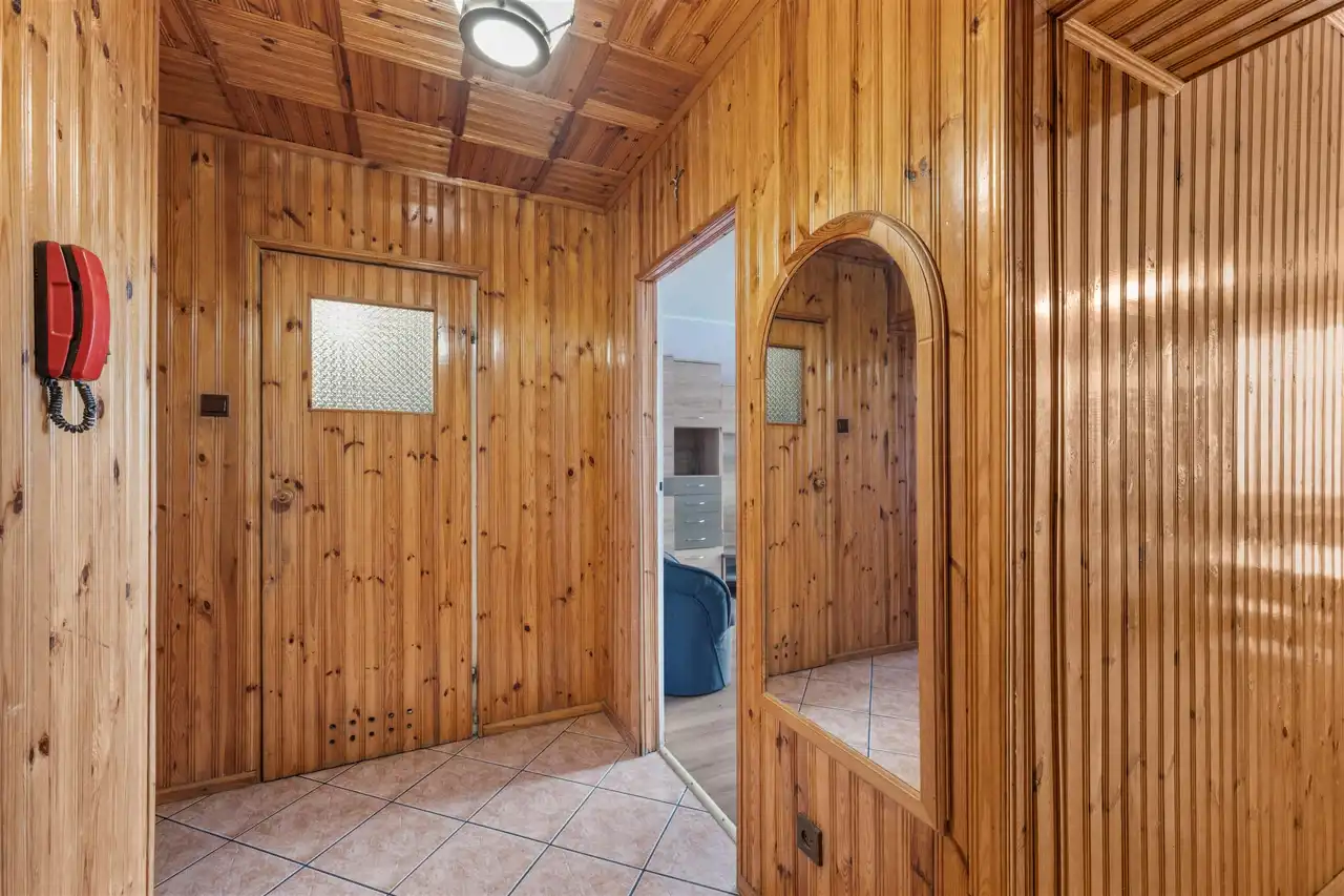 Mieszkanie charakteryzuje się bardzo przemyślanym rozkładem. Sercem lokalu jest obszerny korytarz, który zapewnia swobodną komunikację między wszystkimi pomieszczeniami: