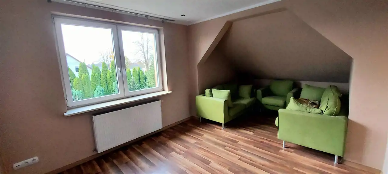 1. Dom rodzinny – z uwagi na rozkład i metraż, dom jest idealny dla rodziny poszukującej komfortowego miejsca do życia z dużą ilością przestrzeni. Salon i otwarta przestrzeń na poddaszu sprzyjają spędzaniu wspólnego czasu, a liczne pomieszczenia zapewniają prywatność każdemu członkowi rodziny. Otwarty pokój na piętrze może być doskonałym miejscem na stworzenie gabinetu do pracy zdalnej, co zapewnia komfort i oddzielenie od części mieszkalnej. Lokalizacja na wsi dodatkowo sprzyja skupieniu i pracy w spokoju. Pokój na dole również możebyć wykorzystany np jako gabinet lekarski lub kosmetyczny.