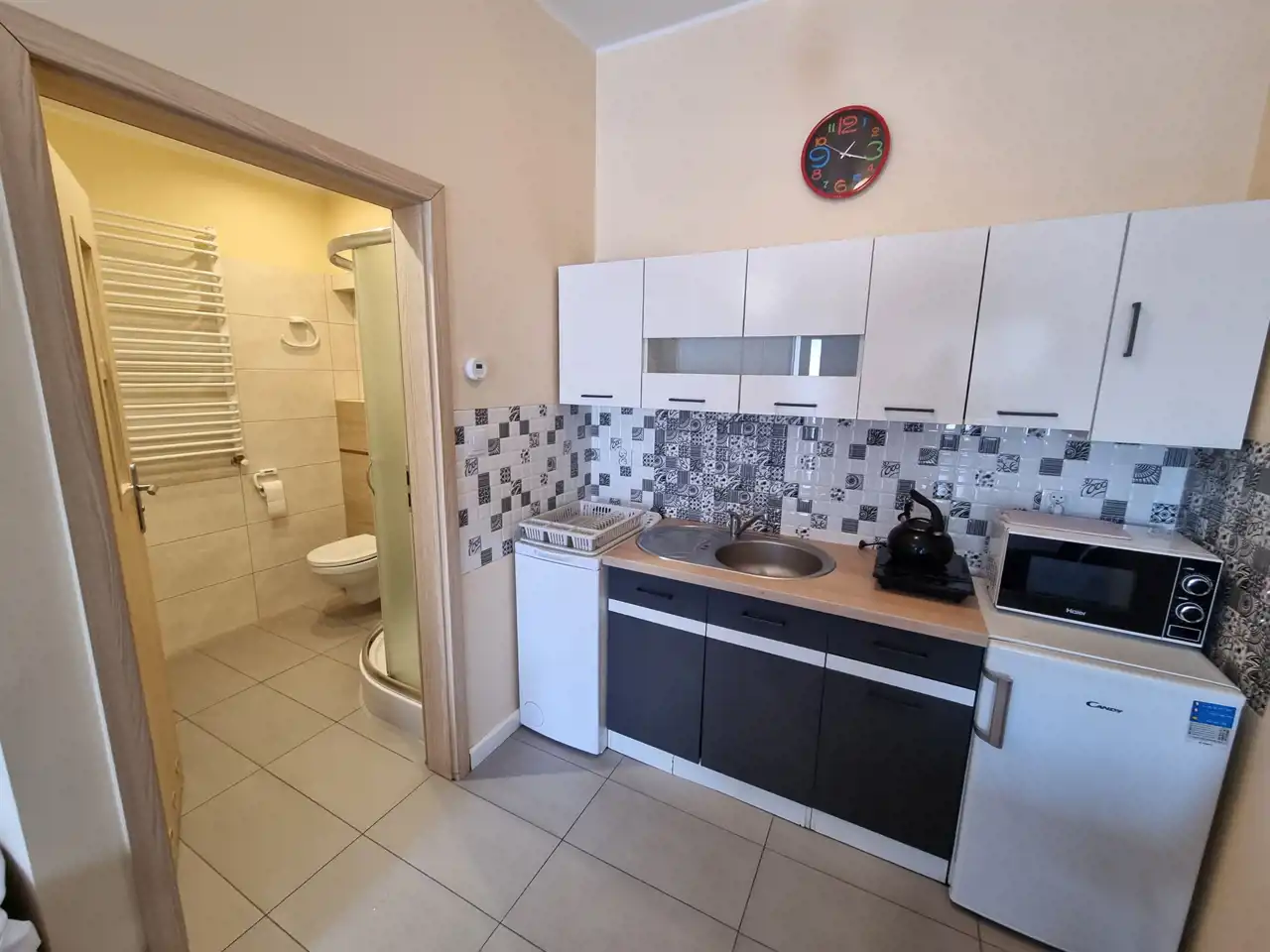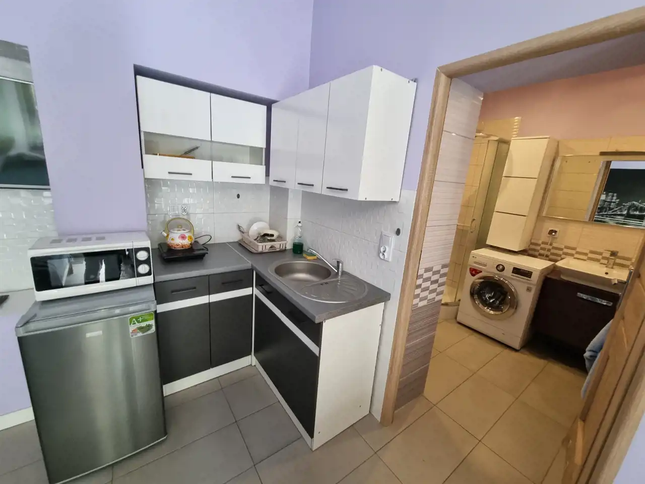 ANEKSY KUCHENNE: zabudowa oraz sprzęty AGD (lodówka, zmywarka, kuchenka mikrofalowa).
