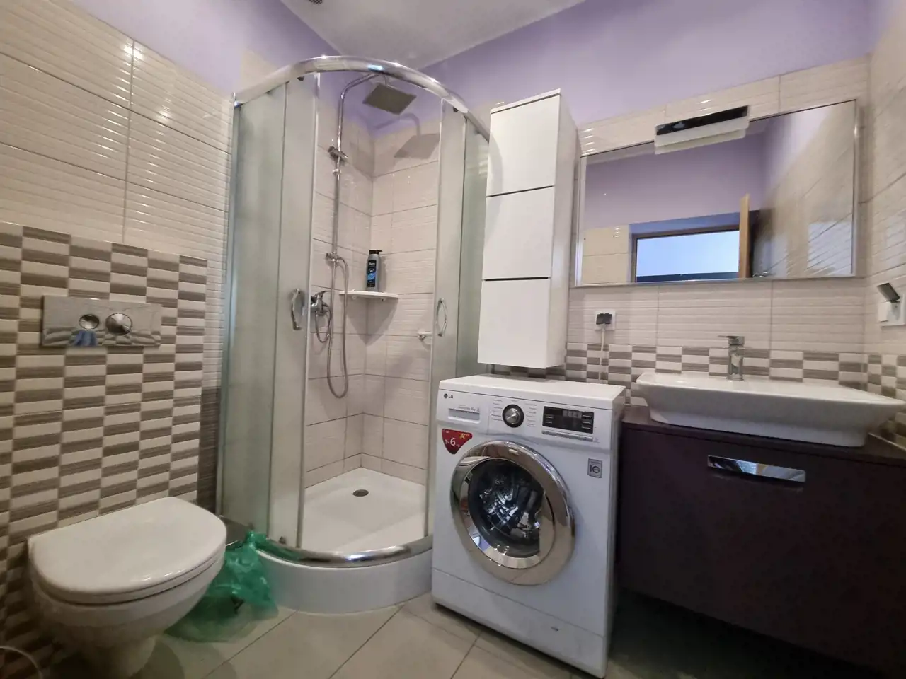 ŁAZIENKA: kabina prysznicowa, umywalka z szafką, pralka automatyczna, toaleta.