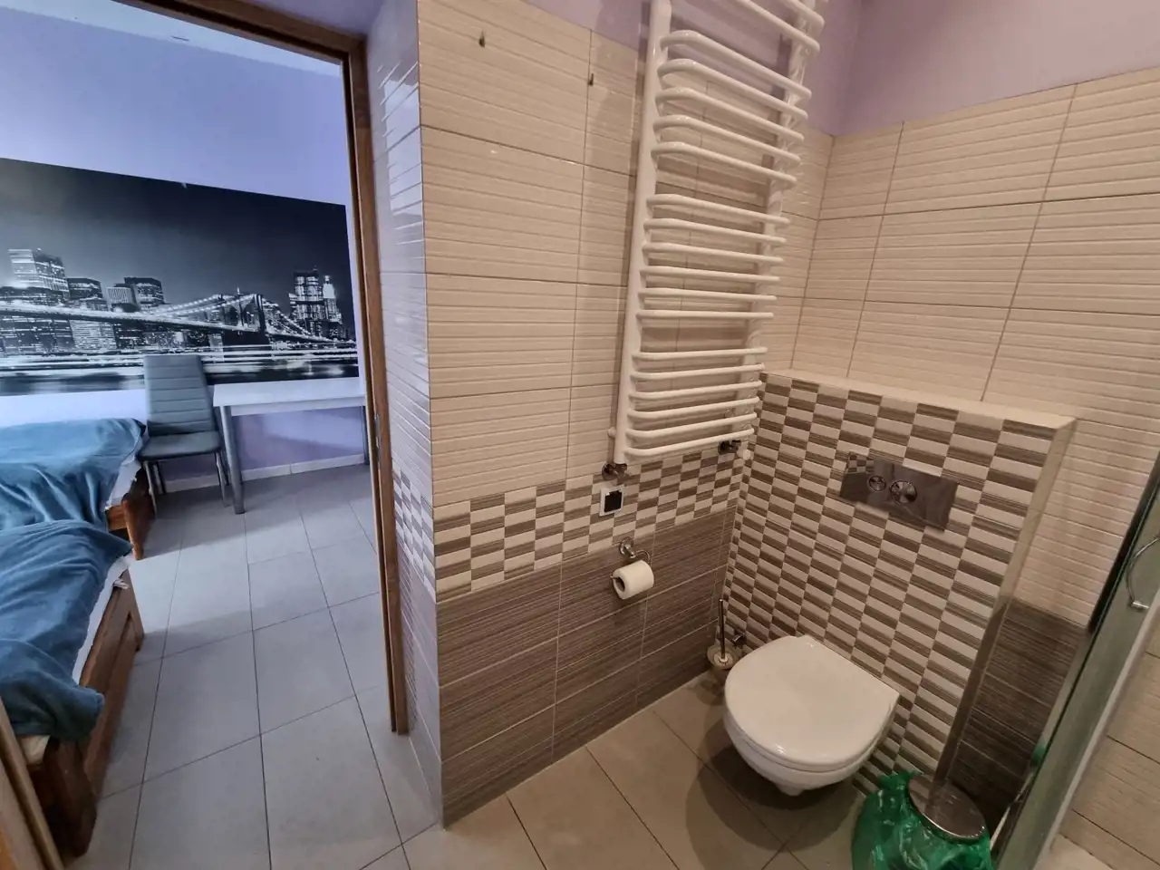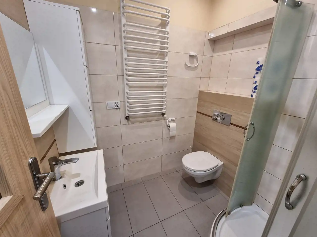 ŁAZIENKA: kabina prysznicowa, umywalka z szafką, pralka automatyczna, toaleta.