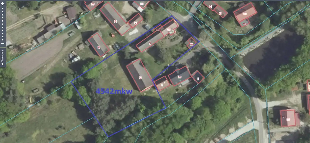 Dom przedwojenny z zabudowaniami gospodarczymi i dużą stodołą, na bardzo dużej działce o pow. 4542mkw. Na terenie nieruchomości budynek mieszkalny dwu kondygnacyjny o pow zabudowy ok 100mkw z przyległymi zabudowaniami gospodarczymi o pow. zabudowy około 160mkw, wolnowstojacy budynek mieszkalny jednokondygnacyjny o pow. ok.45mkw, i duża stodoła o pow. ok 300mkw. wszystkie zabudowania przedwojenne , mały budynek mieszkalny do kapitalnego remontu. Główny budynek mieszkalny to ok 160mkw powierzchni po generalnym remoncie. Na parterze , i są tu trzy pokoje plus jadalnia z kominkiem, kuchnia i łazienka z wc. Na pietrze mamy dwa pokoje , nową łazienkę, kuchnię pom. gospodarcze.