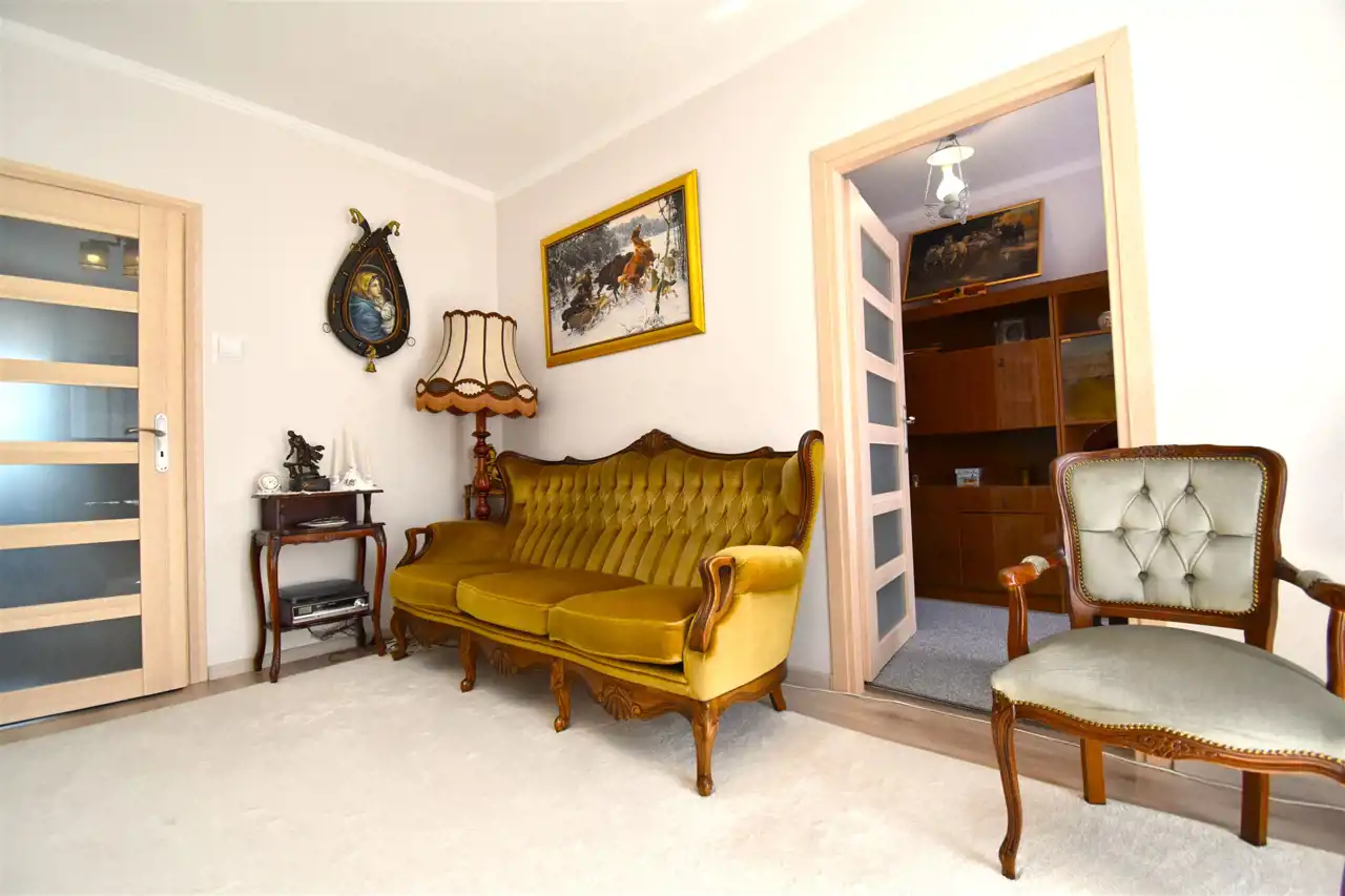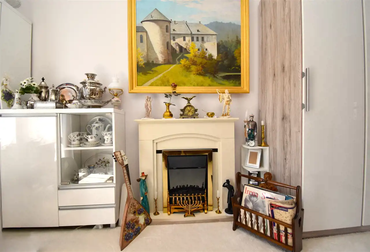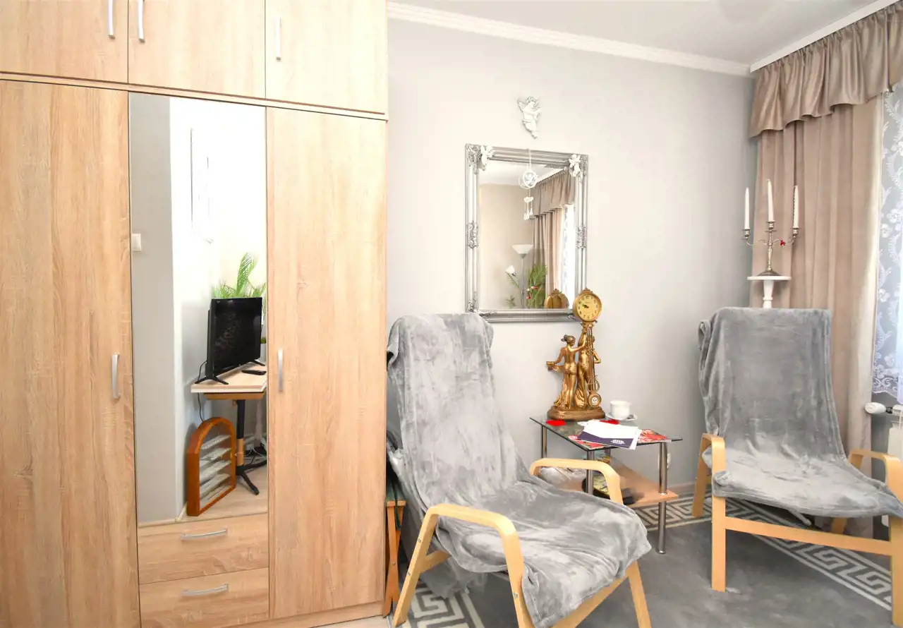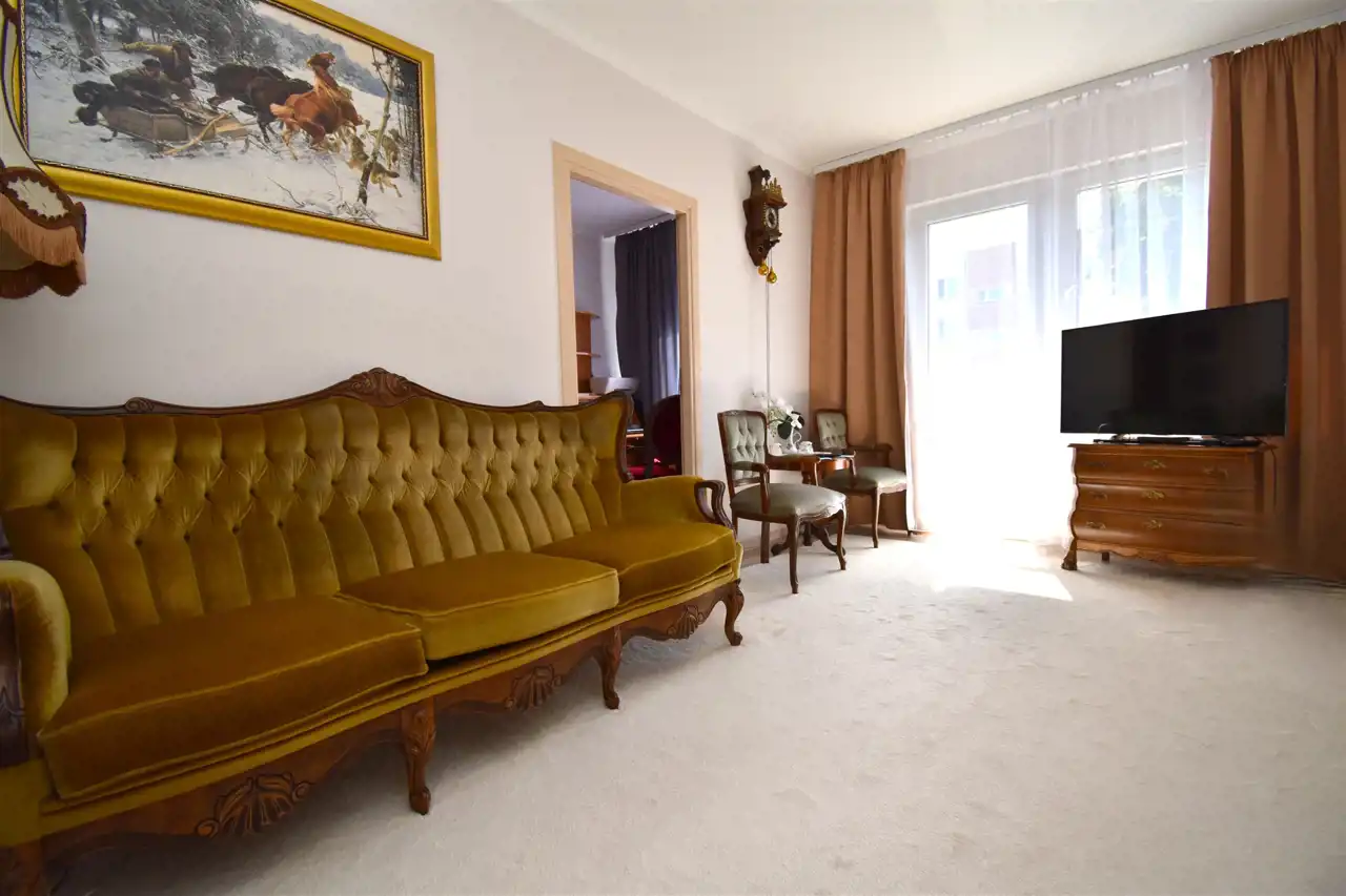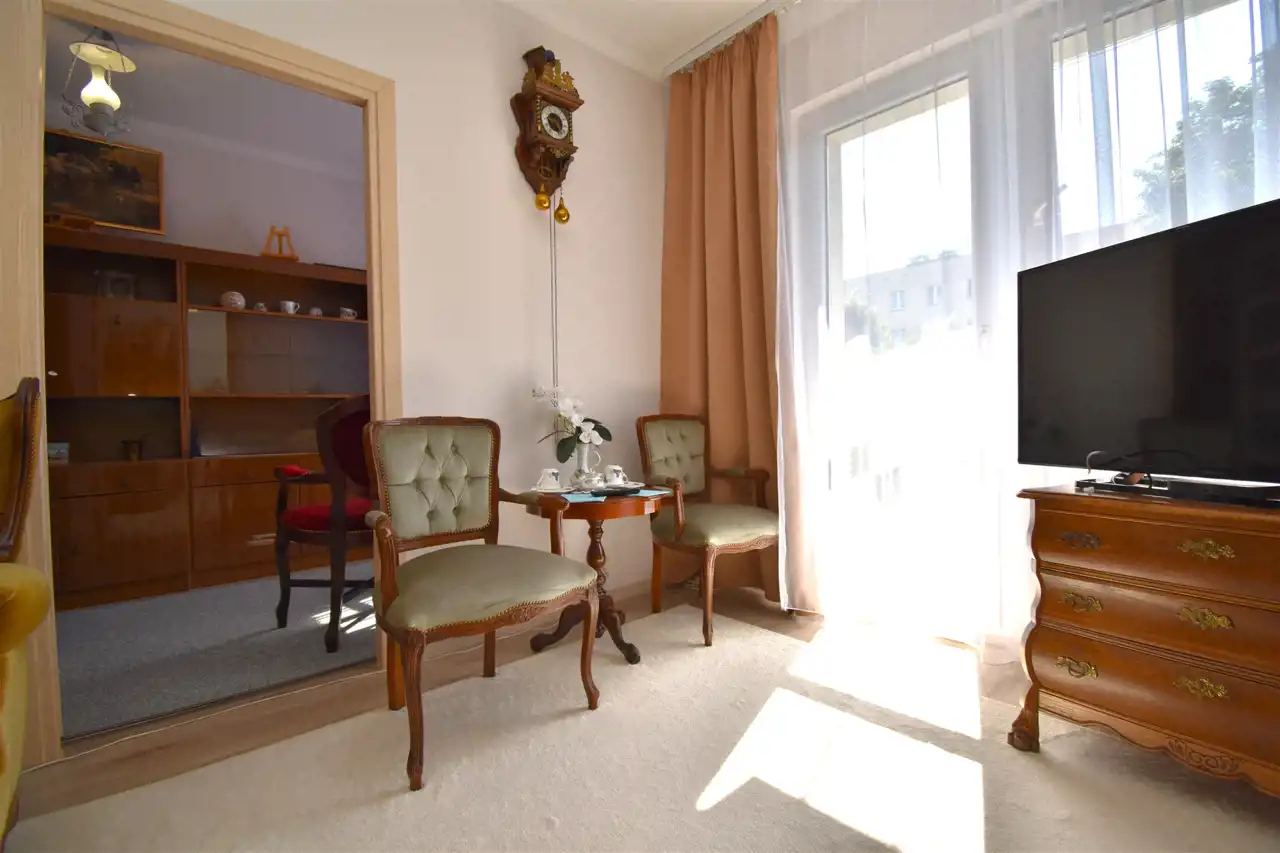 - Trzy pokoje w tym jeden z balkonem - w pełni umeblowane (w dwóch w pokojach nowe meble, kanapy, dywany), nowa elegancka sofa tapicerowana welurem w stylu retro/vintage, krzesła w stylu pałacowej francuskiej klasyki oraz dekoracje ścienne w stylu retro, co daje elegancki, stylizowany klimat wnętrza. W jednym z pokoi część ścian z wykończona dekoracyjnymi panelami z naturalnego drewna co nadaje wnętrzu ciepło i przytulny charakter. Salon z kominkiem elektrycznym, który pełni zarówno funkcję dekoracyjną, jak i praktyczną, tworząc ciepły klimat w chłodniejsze dni.