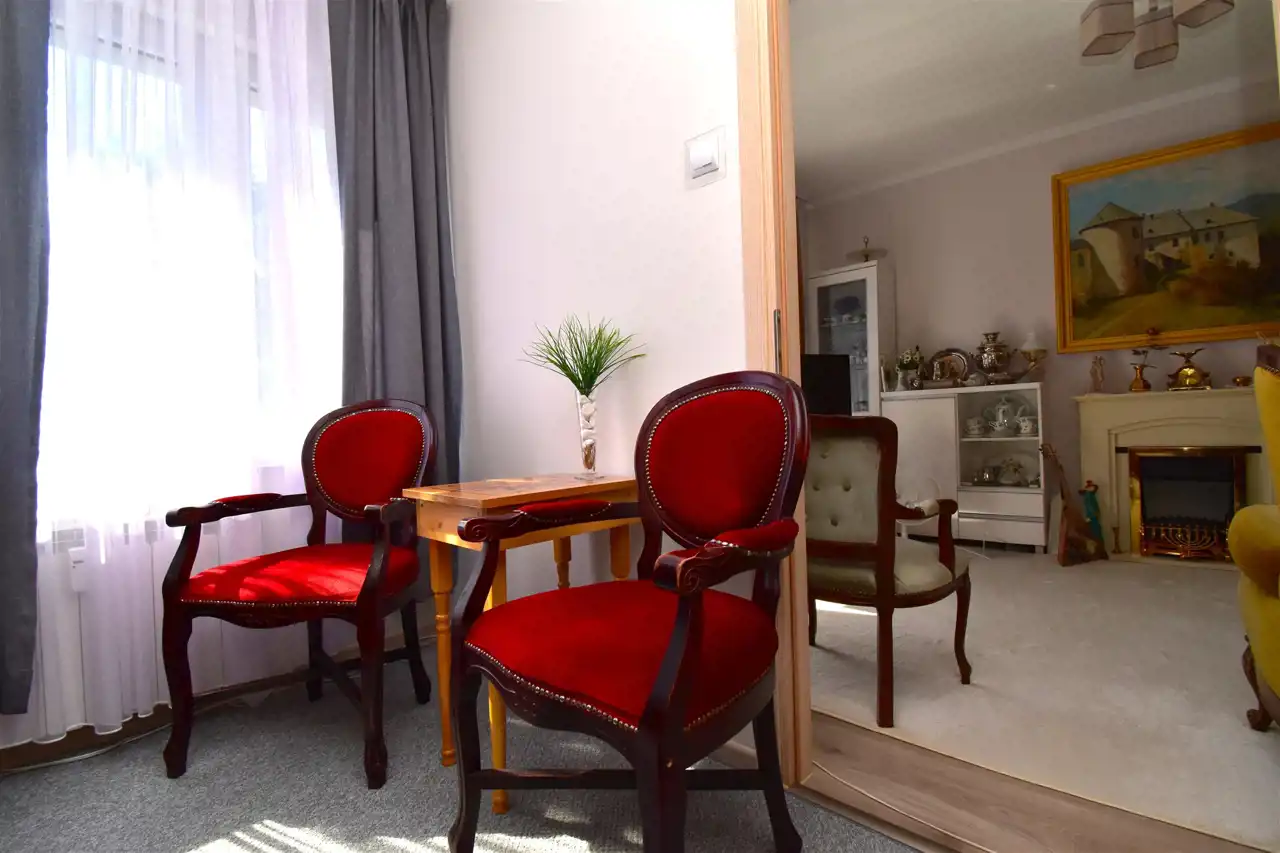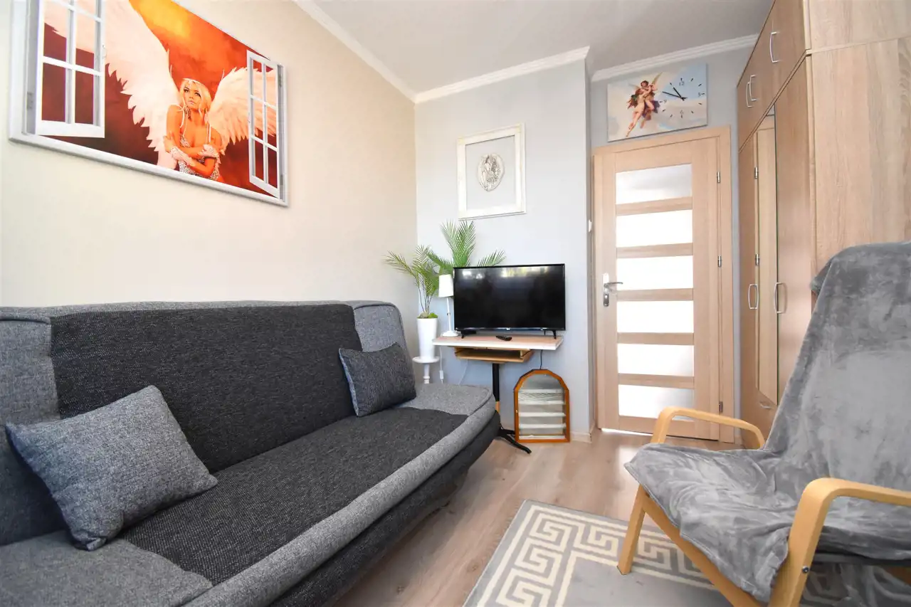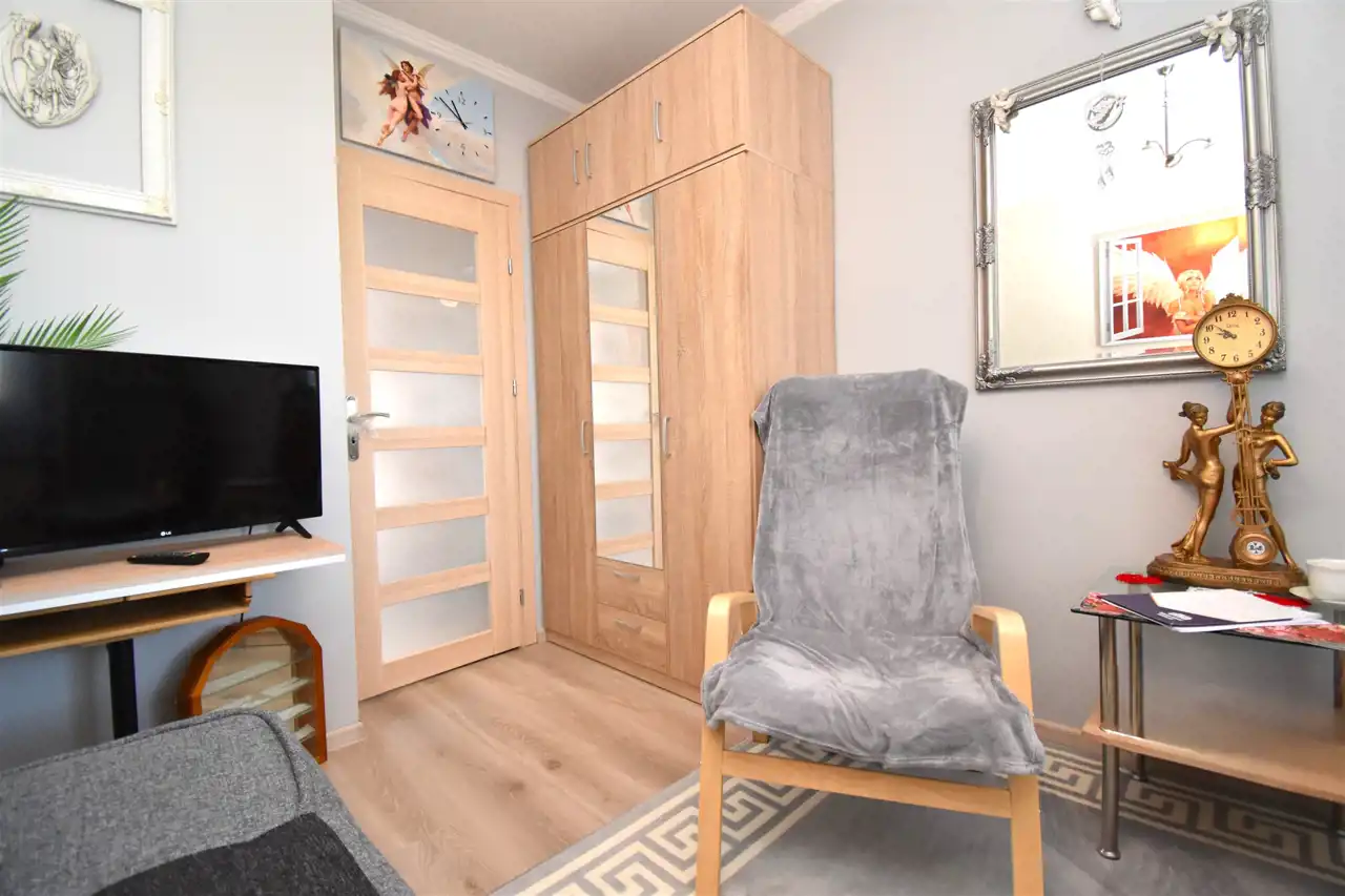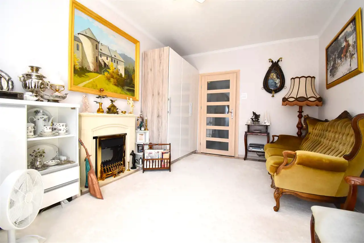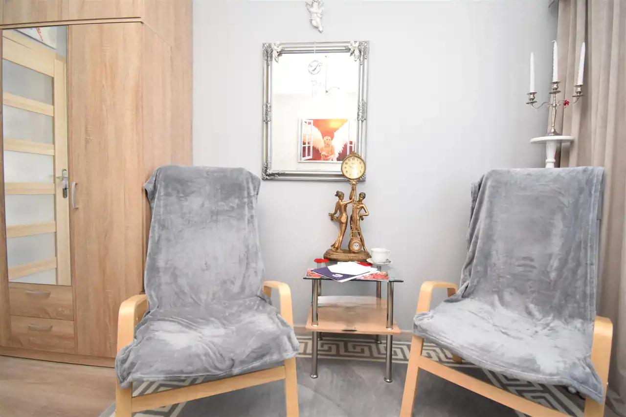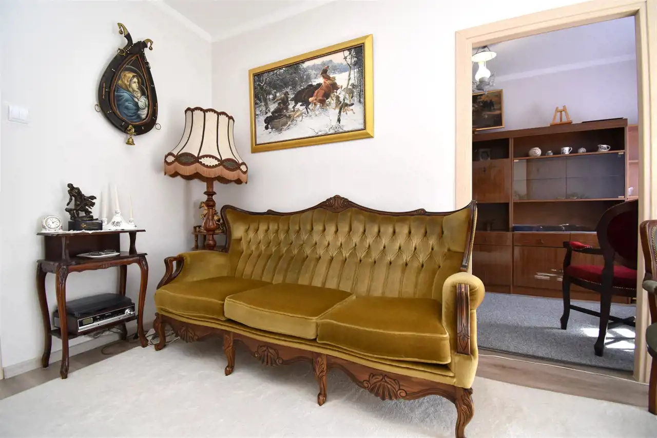 - Trzy pokoje w tym jeden z balkonem - w pełni umeblowane (w dwóch w pokojach nowe meble, kanapy, dywany), nowa elegancka sofa tapicerowana welurem w stylu retro/vintage, krzesła w stylu pałacowej francuskiej klasyki oraz dekoracje ścienne w stylu retro, co daje elegancki, stylizowany klimat wnętrza. W jednym z pokoi część ścian z wykończona dekoracyjnymi panelami z naturalnego drewna co nadaje wnętrzu ciepło i przytulny charakter. Salon z kominkiem elektrycznym, który pełni zarówno funkcję dekoracyjną, jak i praktyczną, tworząc ciepły klimat w chłodniejsze dni.