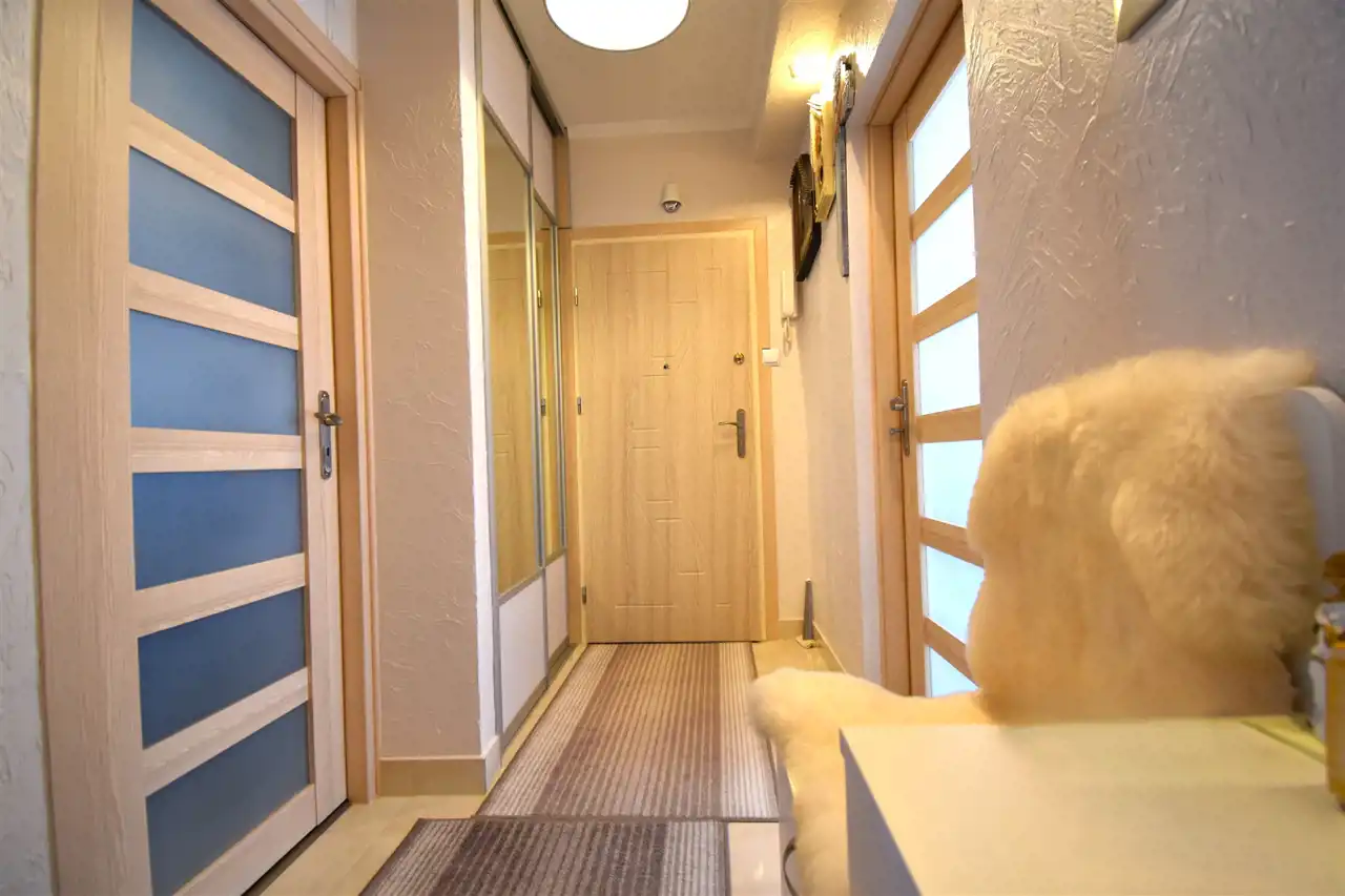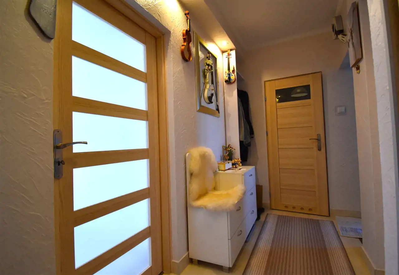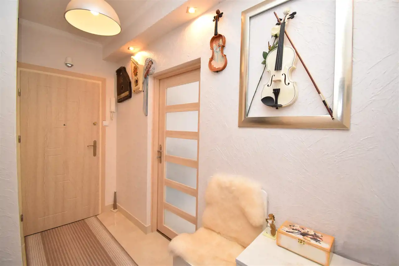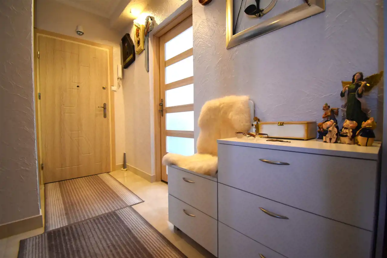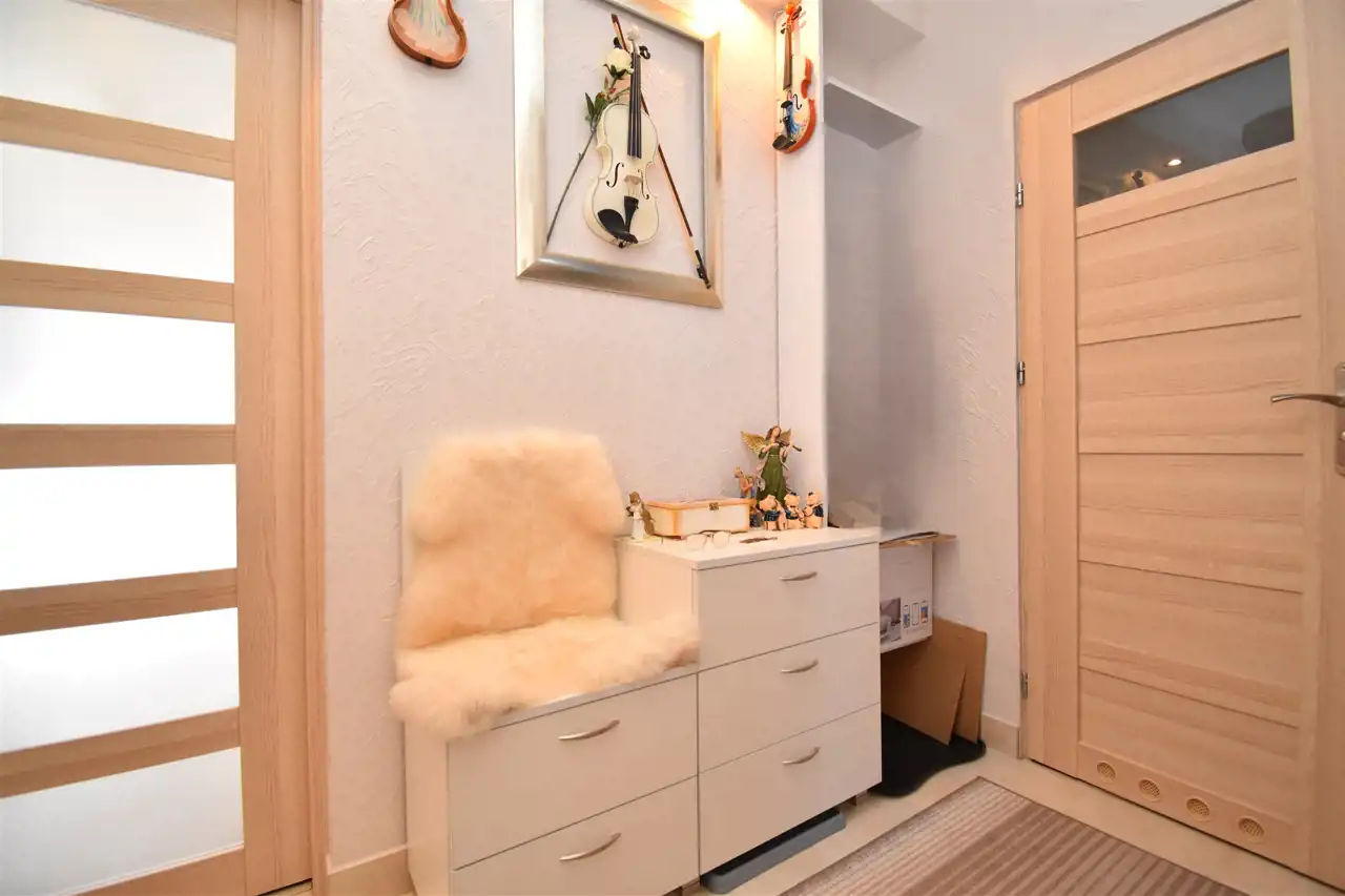 - Przestronny przedpokój utrzymany w jasnych barwach, z szafą w zabudowie, ozdobiony oryginalnymi akcentami dekoracyjnymi, które dodają całości wyjątkowego charakteru;