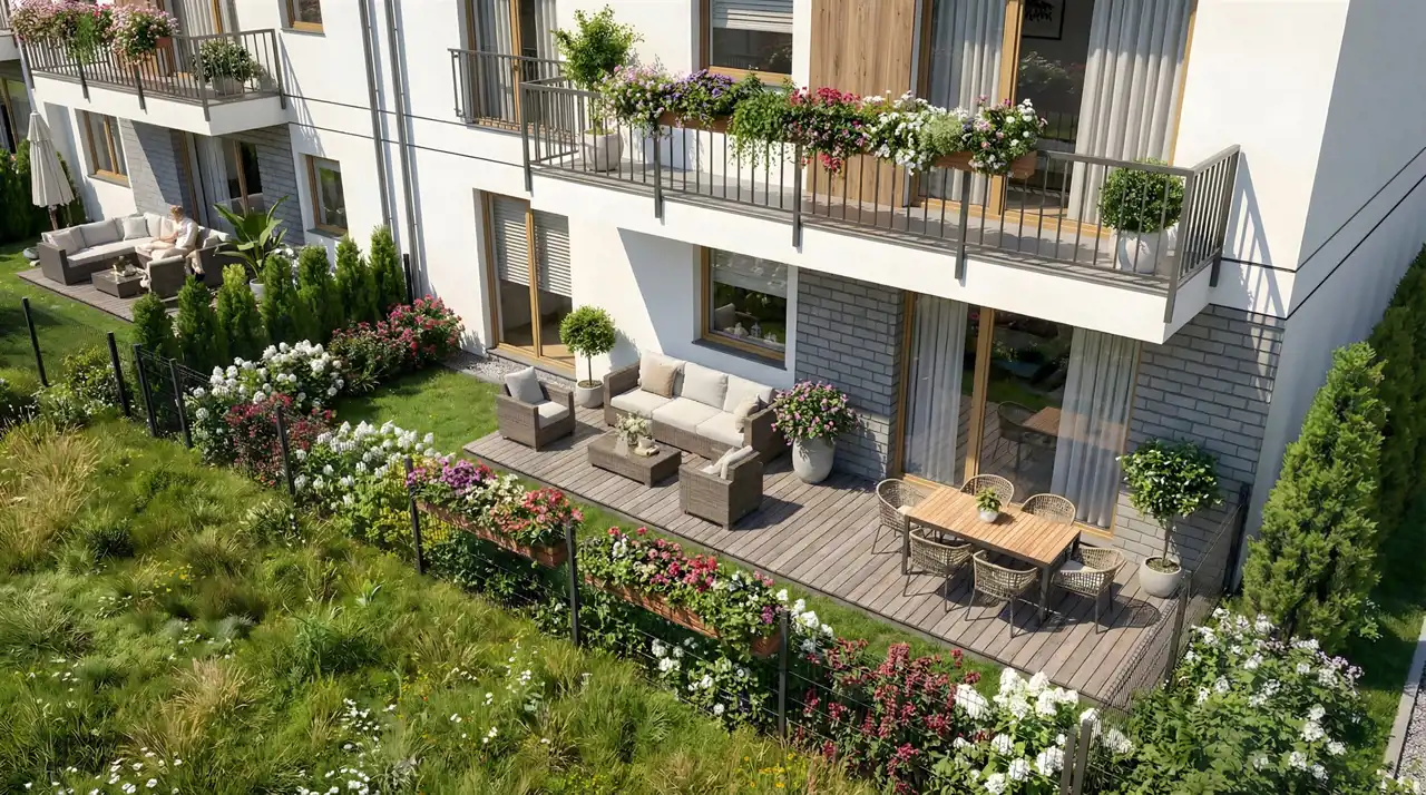 - mieszkania na parterze – z prywatnym ogródkiem, idealnym do relaksu lub dla rodzin z dziećmi