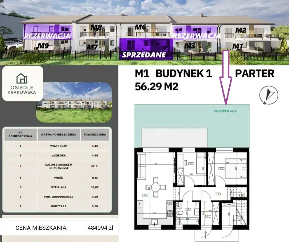 - M1 powierzchnia: 56,29 m² cena mieszkania - 484 094 zł / 8 600 zł za m2 -DOSTĘPNE Pomieszczenia (m2): 1 WIATROŁAP 3,45; 2 ŁAZIENKA 4,48; 3 SALON Z ANEKSEM KUCHENNYM 22,51; 4 POKÓJ 8,12; 5 SYPIALNIA 10,67; 6 POM. GOSPODARCZE 0,80; 7 KORYTARZ 6,26. Ogródek: 42 m2.