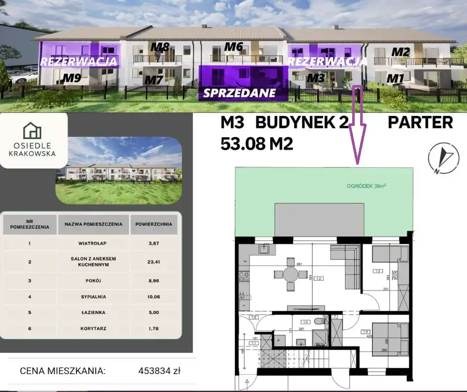 - M3 powierzchnia: 53,08 m ² cena mieszkania - 453 834 zł / 8 550 zł za m2 -DOSTĘPNE Pomieszczenia (m2): 1 WIATROŁAP 3,87; 2 SALON Z ANEKSEM KUCHENNYM 23,41; 3 POKÓJ 8,96; 4 SYPIALNIA 10,06; 5 ŁAZIENKA 5,00; 6 KORYTARZ 1,78. Ogródek: 39 m2.