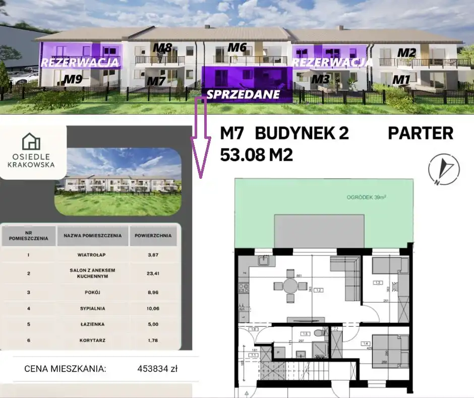 M5 powierzchnia: 56,29 m² -SPRZEDANE!- M7 powierzchnia: 53,08 m² cena mieszkania - 453 834 zł / 8 550 zł za m2 -DOSTĘPNE Pomieszczenia (m2): 1 WIATROŁAP 3,87; 2 SALON Z ANEKSEM KUCHENNYM 23,41; 3 POKÓJ 8,96; 4 SYPIALNIA 10,06; 5 ŁAZIENKA 5,00; 6 KORYTARZ 1,78. Ogródek: 39 m2.