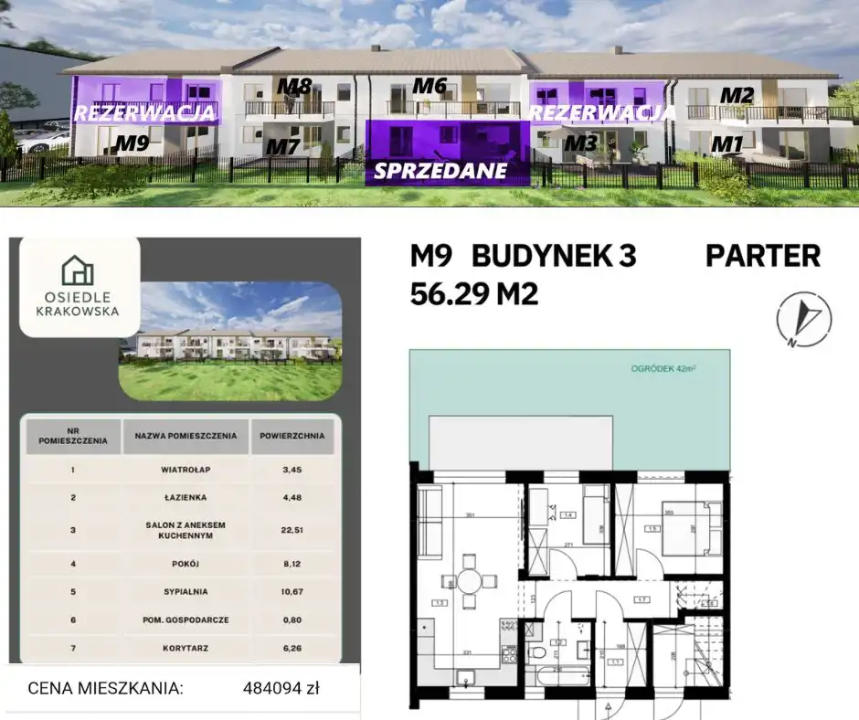 - M9 powierzchnia: 56,29 m² cena mieszkania - 484 094 zł / 8 600 zł za m2 -DOSTĘPNE Pomieszczenia (m2): 1 WIATROŁAP 3,45; 2 ŁAZIENKA 4,48; 3 SALON Z ANEKSEM KUCHENNYM 22,51; 4 POKÓJ 8,12; 5 SYPIALNIA 10,67; 6 POM. GOSPODARCZE 0,80; 7 KORYTARZ 6,26. Ogródek: 42 m2.
