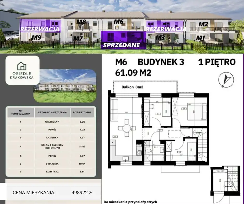 - M6 powierzchnia:61,09 m² cena mieszkania: 498 922 zł / 8 166 zł m2 -DOSTĘPNE Pomieszczenia (m2): 1 WIATROŁAP 3,06; 2 POKÓJ 7,03; 3 ŁAZIENKA 4,27; 4 SALON Z ANEKSEM KUCHENNYM 21,82; 5 POKÓJ 8,37; 6 SYPIALNIA 10,64; 7 KORYTARZ 5,91. Balkon -8 m2.