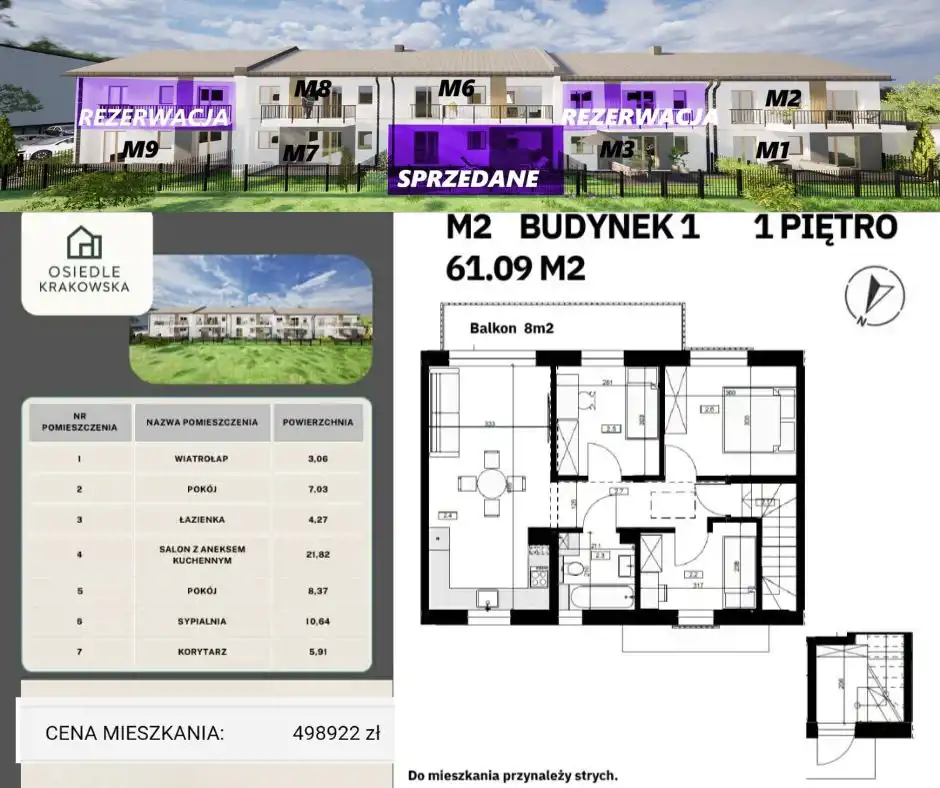 - M2 powierzchnia: 61,09 m² cena mieszkania: 498 922 zł / 8 166 zł m2 -DOSTĘPNE Pomieszczenia (m2): 1 WIATROŁAP 3,06; 2 POKÓJ 7,03; 3 ŁAZIENKA 4,27; 4 SALON Z ANEKSEM KUCHENNYM 21,82; 5 POKÓJ 8,37; 6 SYPIALNIA 10,64; 7 KORYTARZ 5,91. Balkon -8 m2.