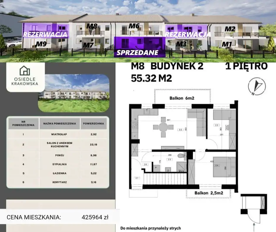 - M8 powierzchnia:55,32 m²d cena mieszkania:425 964 zł / 7 700 zł m2 -DOSTĘPNE Pomieszczenia (m2): 1 WIATROŁAP 2,92; 2 SALON Z ANEKSEM KUCHENNYM 23,19; 3 POKÓJ 8,96; 4 SYPIALNIA 11,87; 5 ŁAZIENKA 5,22; 6 KORYTARZ 3,16. Balkon -6 m2.