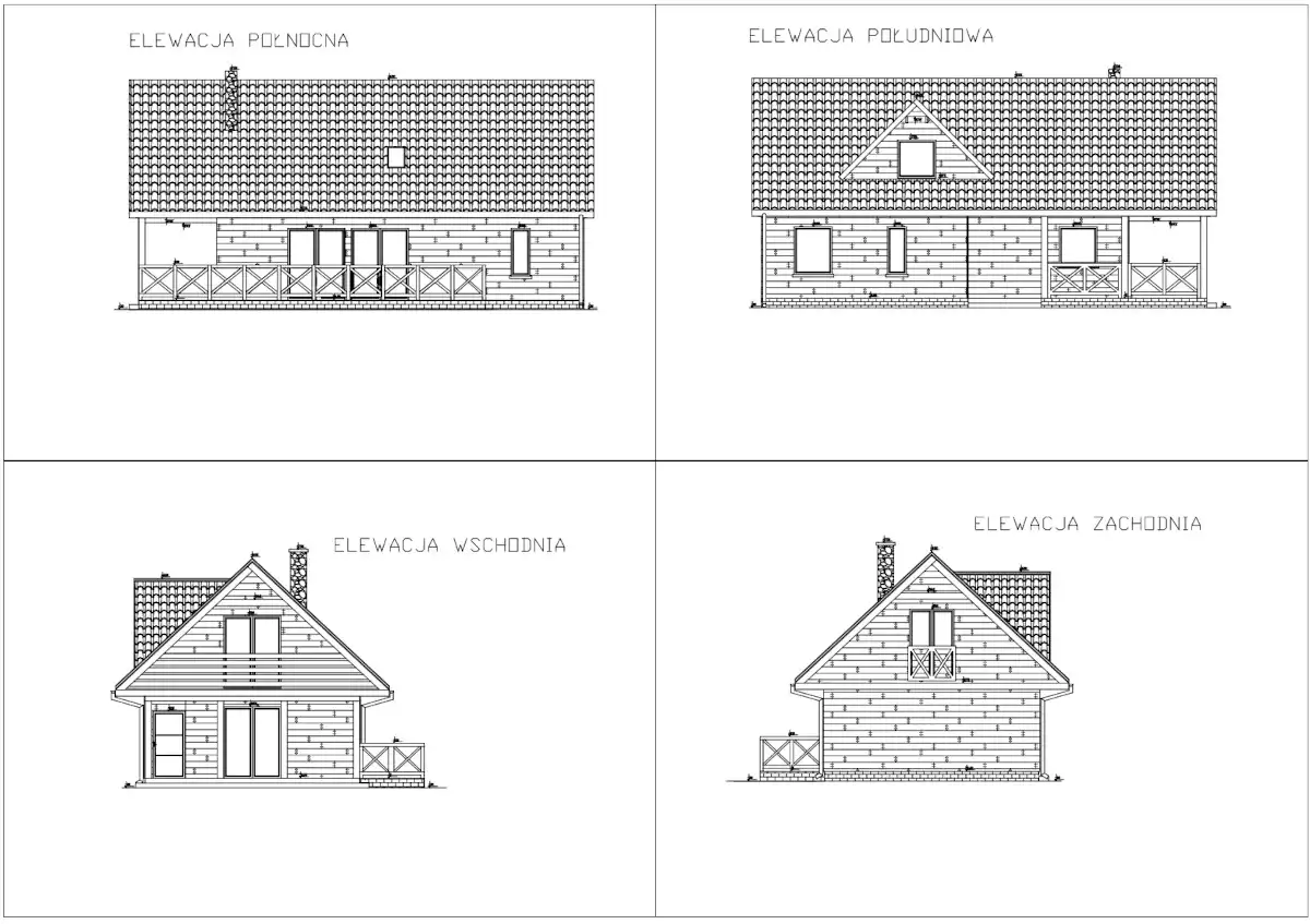 Dom drewniany w konstrukcji szkieletowej , pokryty dachem w kolorze ceglastoczerwonym .