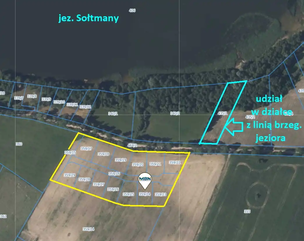 Udział w działce z linią brzegową jeziora Sołtmany (w odległości od 50 m do 200 m w zależności od wybranej działki budowlanej);