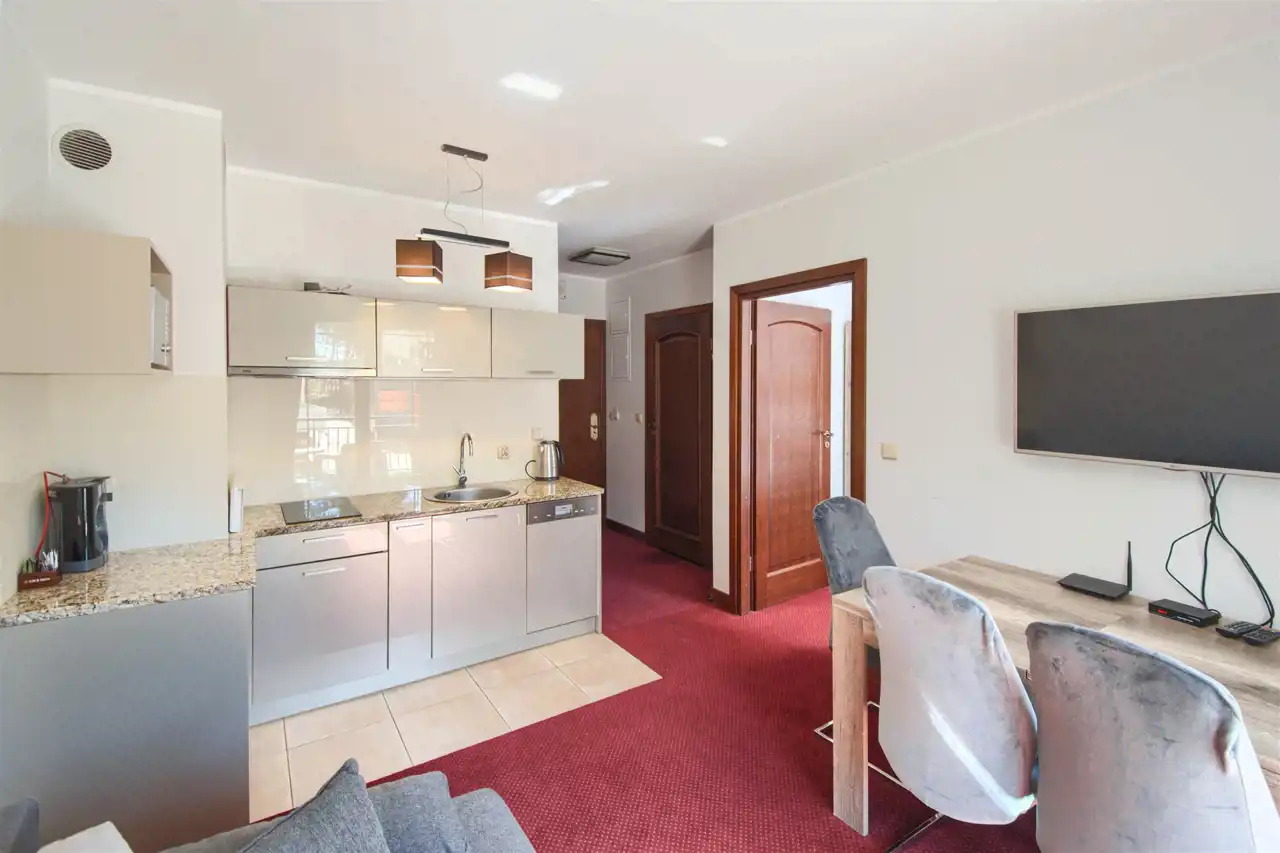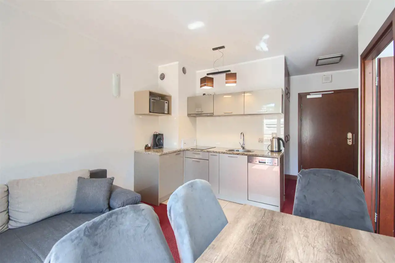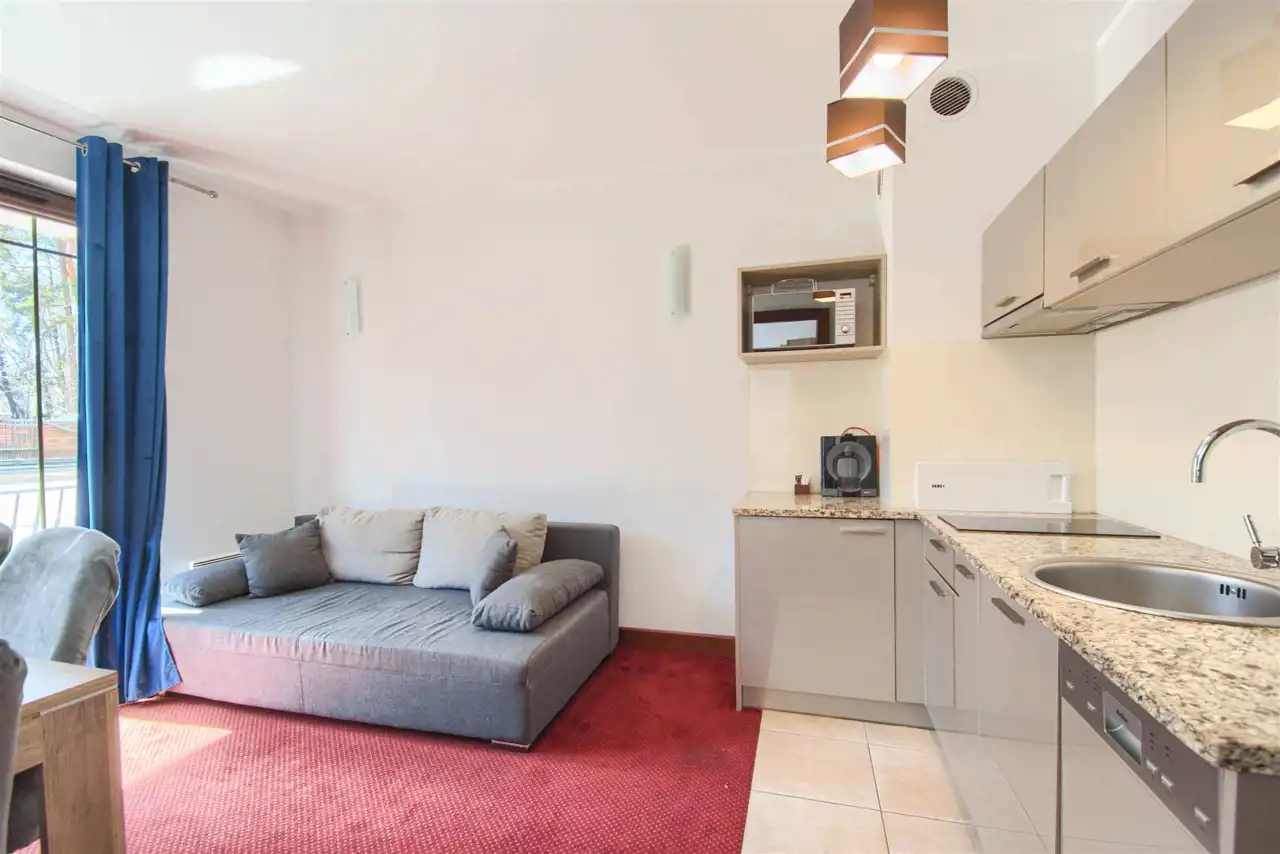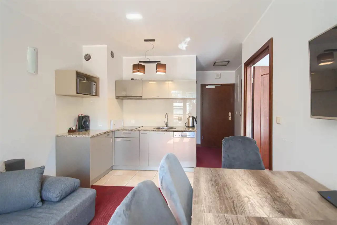 Lokal składa się z salonu z aneksem kuchennym wyposażonym w nowoczesną zabudowę meblową z lodówką podblatową, płytą elektryczną dwupalnikową, mikrofalówką, zmywarką, pochłaniaczem. Z salonu jest wyjście na duży balkon/taras. W łazience kabina prysznicowa, pralka. W sypialni znajduje się duża szafa, duże łóżko z materacem. W przedpokoju duża zabudowana szafa. Lokal wyposażony w naczynia, pościel i ręczniki, żelazko, czajnik elektryczny. Do tej pory wynajmowany w systemie najmu krótkoterminowego prowadzonego przez firmę Sun&Snow, całkowicie wyposażony i gotowy do dalszego najmu lub dla osób prywatnych.
