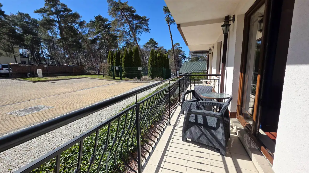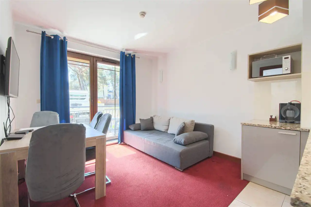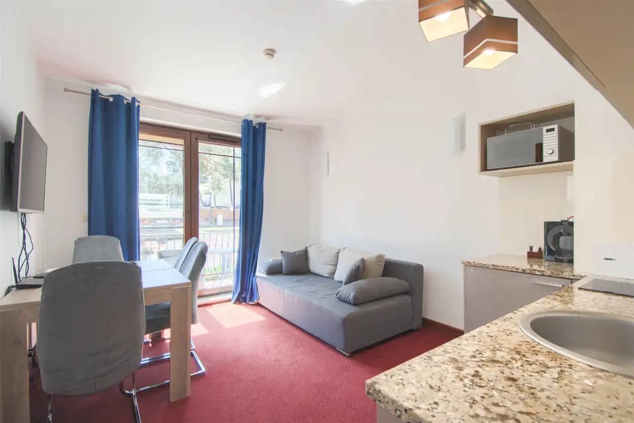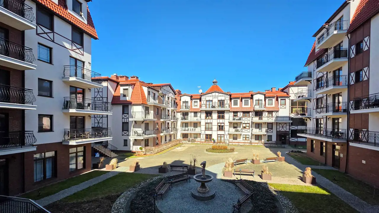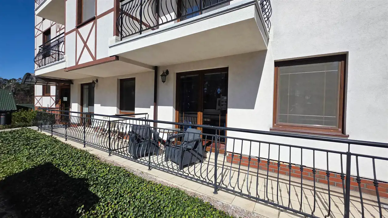 Lokal składa się z salonu z aneksem kuchennym wyposażonym w nowoczesną zabudowę meblową z lodówką podblatową, płytą elektryczną dwupalnikową, mikrofalówką, zmywarką, pochłaniaczem. Z salonu jest wyjście na duży balkon/taras. W łazience kabina prysznicowa, pralka. W sypialni znajduje się duża szafa, duże łóżko z materacem. W przedpokoju duża zabudowana szafa. Lokal wyposażony w naczynia, pościel i ręczniki, żelazko, czajnik elektryczny. Do tej pory wynajmowany w systemie najmu krótkoterminowego prowadzonego przez firmę Sun&Snow, całkowicie wyposażony i gotowy do dalszego najmu lub dla osób prywatnych.