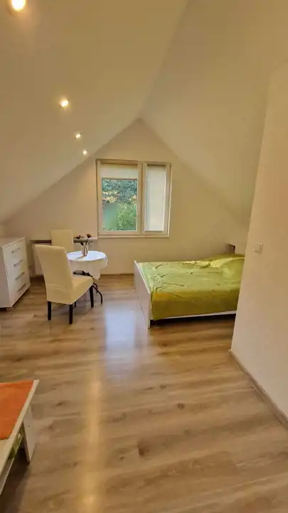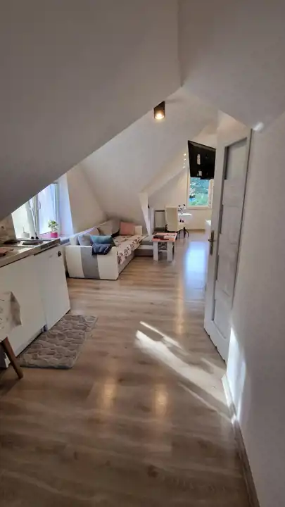 W poddaszu znajduje się studio z łazienką z WC o powierzchni po podłodze 51 metrów kwadratowych do dowolnej aranżacji.