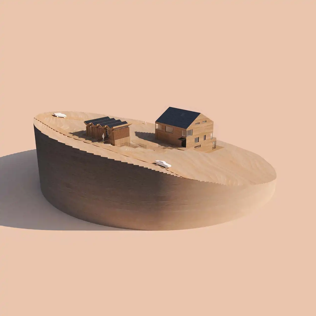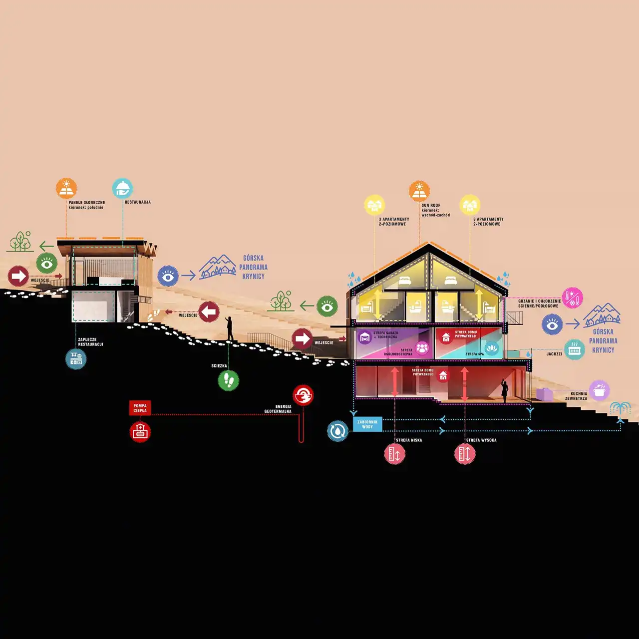 Koncepcja zabudowy działki obejmuje budowę dwóch budynków – głównego mieszczącego dom jednorodzinny, strefę spa i sześć niezależnych apartamentów oraz niewielkiego budynku usługowego pełniącego funkcję niewielkiej restauracji.