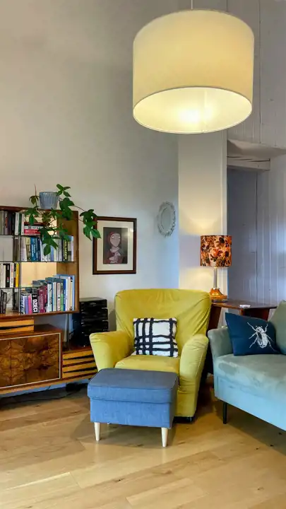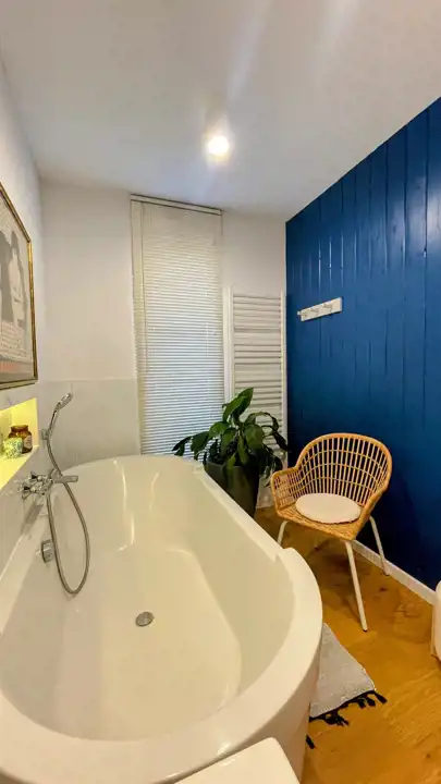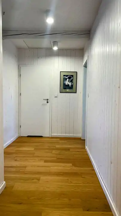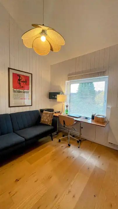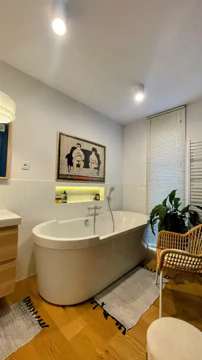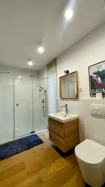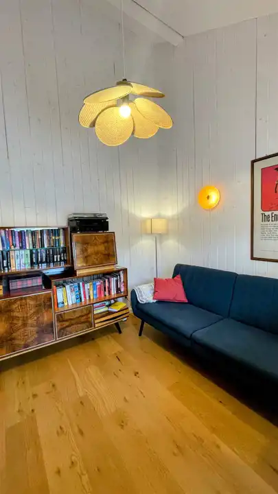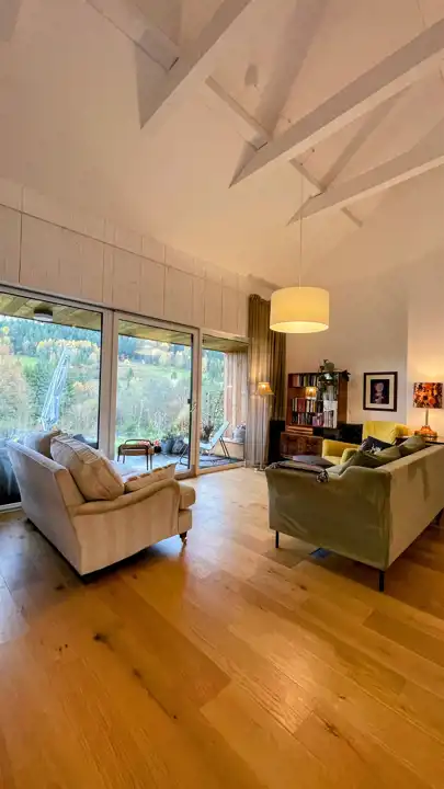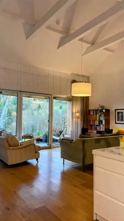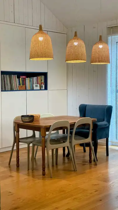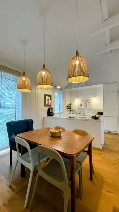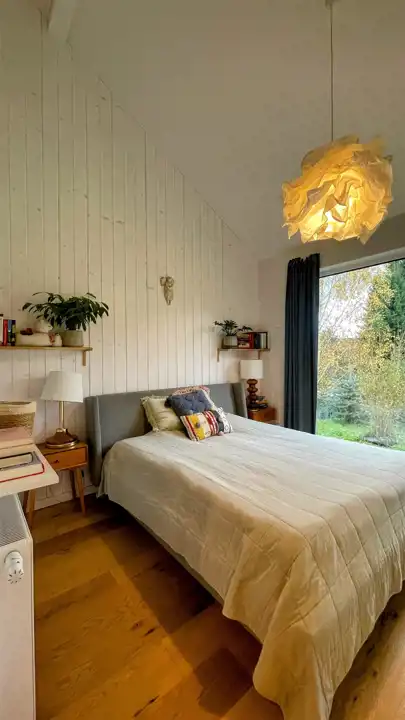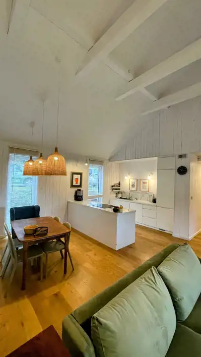 Przestrzeń jest jasna, ciepła, naturalna — a klimat wnętrz wykończonych drewnem daje natychmiastowe poczucie komfortu i jakości. Niesamowitego klimatu nadają wysokie przestrzenie pod sam szczyt z widocznymi belkami drewnianymi.