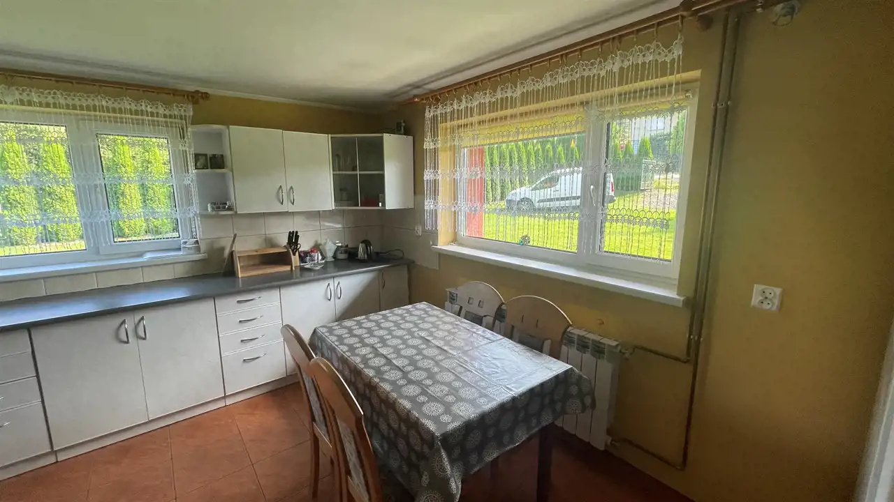 Dom wybudowany w latach 90. Podstawowy materiał to cegła. Budynek na dwóch kondygnacjach do zamieszkania, poddasze do wykończenia, wysokość do kalenicy wynosi 5,5 metra. Co daje możliwość aranżacji włącznie z antresolą.